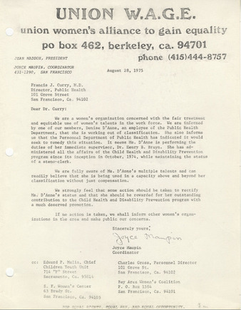 Collection: Denise D'Anne Collection Institution: GLBT Historical Society Creator: Maupin, Joyce Date: Aug. 28, 1975 Topics: Child health services, Labor unions, LGBTQ+ activists, Public health administration, Trans women, Transgender people in the workplace, Transgender political activists Subject: Bay Area Women's Coalition, Charles Gross, Children Youth Unit, Denise D'Anne, Edward P. Melia, Francis J. Curry, Henry B. Bruyn, S.F. Women's Center, Union W.A.G.E. Description: Letter of support for Denise D'Anne, advocating for her job promotion in the Public Health Department.