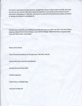 Collection: Felicia Elizondo/Felicia Flames Collection Institution: GLBT Historical Society Creator: Elizondo, Felicia Date: circa 2010 to circa 2020 Topics: Chicano/a/x LGBTQ+ people, Chicano/a/x transgender people, Drag queens, Female impersonators, Latino/a/x LGBTQ+ people, Latino/a/x transgender people, LGBTQ+ communities, Trans women Subject: Charles Pierce, Christine Jorgensen, Gina La Divina, José Sarria, Pat Montclaire, Vicki Marlane, Victor Torres Description: This is a list of heroes that Felicia Elizondo looked up to, during her time in the Tenderloin. This item comes from the Felicia “Flames” Elizondo papers (#2021-06) at the GLBT Historical Society. ... -