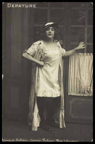A French prisoner of war posing in drag at a prisoner of war camp in Cottbus. Photographic postcard by P. Tharan, 191-.