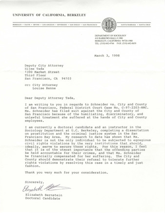 Collection: Victoria Schneider Papers Institution: GLBT Historical Society Creator: Bernstein, Elizabeth Date: Mar. 3, 1998 Topics: Civil rights, Harassment, Intersex people, Law, LGBTQ+ sex workers, Transphobia Subject: Hajime Tada, Louise Renne, Strip searching, Victoria Schneider Description: A letter from University of California Berkeley sociology doctoral candidate Elizabeth Bernstein to Deputy Attorney Hajime Tada regarding the case of Victoria Schneider v. City and County of San Fr... -