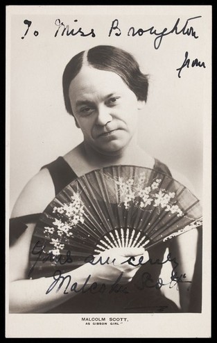 Malcolm Scott in character as a "Gibson Girl". Photographic postcard, 1908.