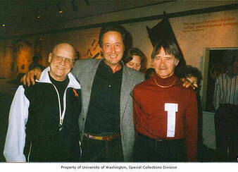Collection: Don Paulson and Skippy LaRue Photograph Collection Institution: University of Washington Libraries Creator: Date: 1997 Topics: Female impersonators, Friendships, Gay men, LGBTQ+ people Subject: Daryl Beckman, Don Paulsen, Skippy LaRue Description: Photograph of Skippy LaRue, Daryl Beckman, and Don Paulson standing in a line with their arms around each other at the Governor's Awards. They are wearing a black and white half zip windbreaker, gr... -