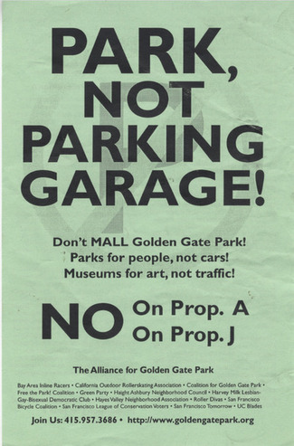 Collection: Denise D'Anne Collection Institution: GLBT Historical Society Creator: D'Anne, Denise Date: 1998 Topics: Golden Gate Park (San Francisco, Calif.) Subject: Harvey Milk LGBT Democratic Club, Proposition A, Proposition J, University of California San Francisco Description: A flyer attempting to persuade San Francisco residents to vote against proposition J and proposition A on the upcoming ballot. Proposition J would allow private funds to create parking space in Gol...