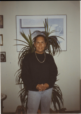 Collection: Felicia Elizondo/Felicia Flames Collection Institution: GLBT Historical Society Creator: Date: Unknown Topics: Chicano/a/x LGBTQ+ people, Drag queens, Latino/a/x transgender people, Trans women Description: Photo of Felicia Elizondo, standing in front of a houseplant and wearing a black sweater. This item comes from the Felicia “Flames” Elizondo papers (#2021-06) at the GLBT Historical Society. Felic... -