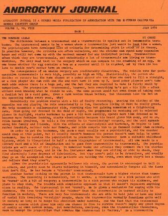 Collection: Short Runs of Periodicals Institution: ONE Archives at the USC Libraries Creator: D'Arthur, Shava Date: Jul. 1978 Topics: Crossdressing, Gender identity, Gender-affirming surgery, Hormone therapy (Gender), LGBTQ+ suicide, Medicaid, Transsexual people, Transvestites Description: Androgyny Journal Number 8 (July 1978) is a monthly publication by Gender Media Publications in association with the Southern California Gender Identity Group. The main feature is "The Nowhere Girl... -