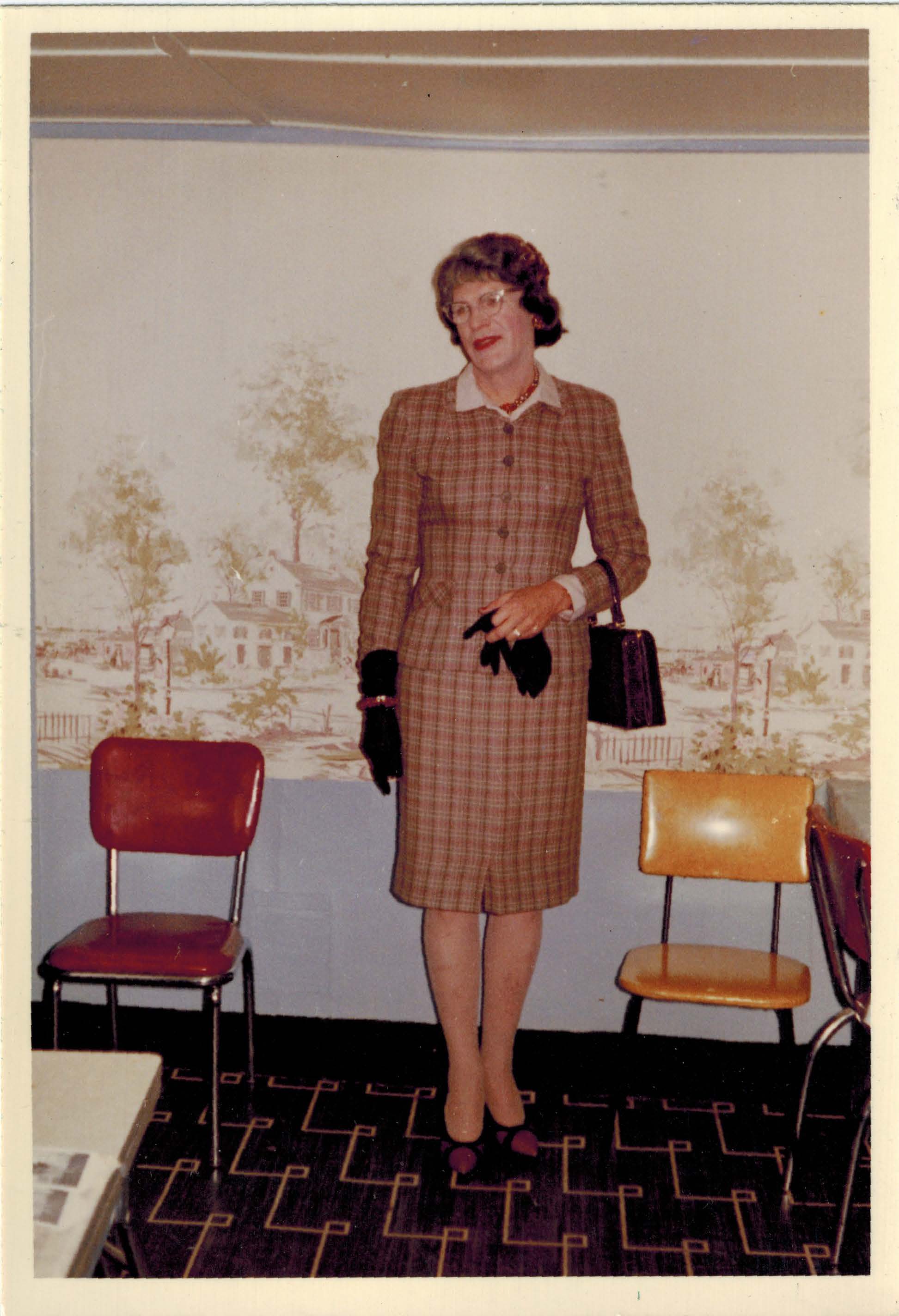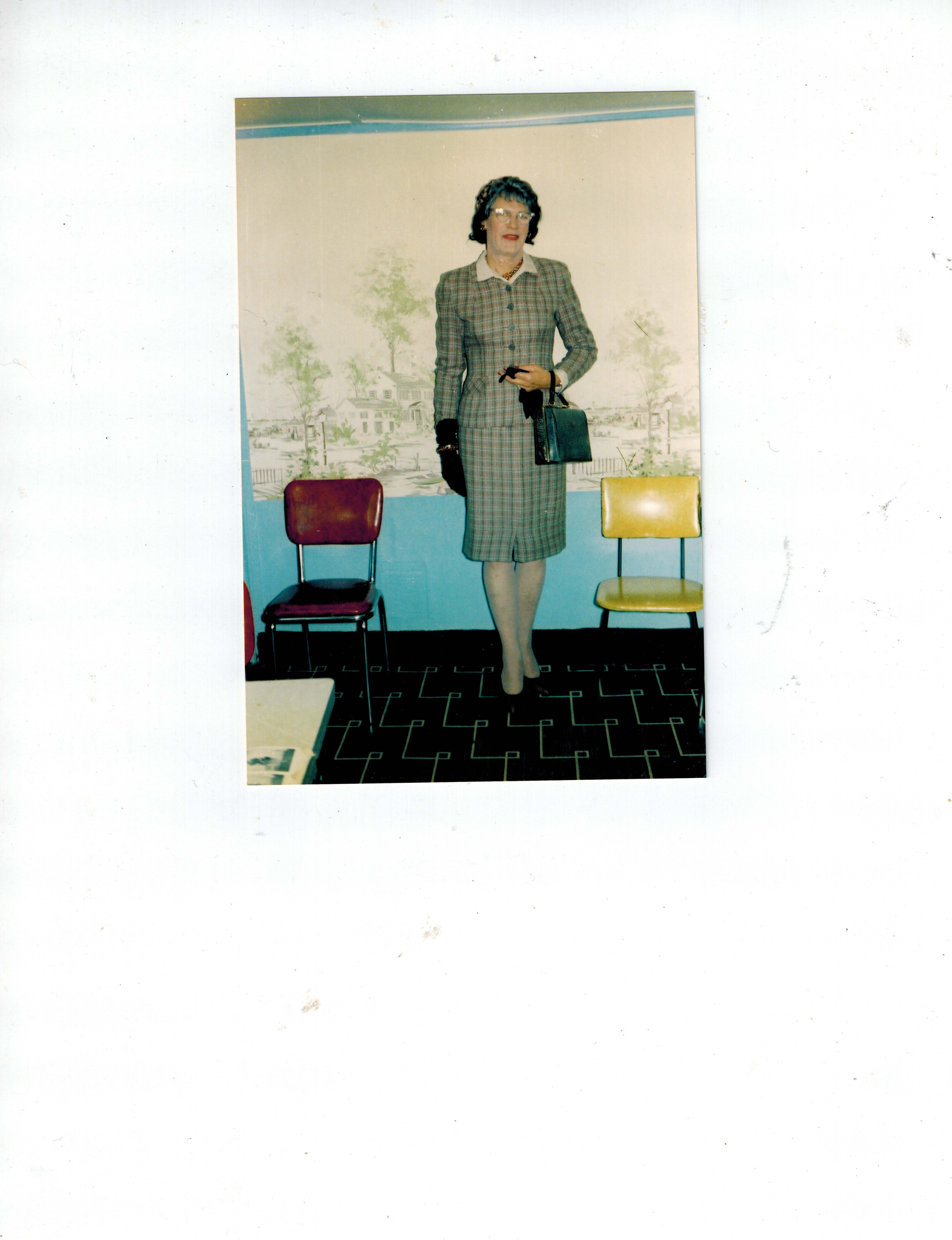 Photographs of Felicity Chandelle standing in a plaid skirt suit.