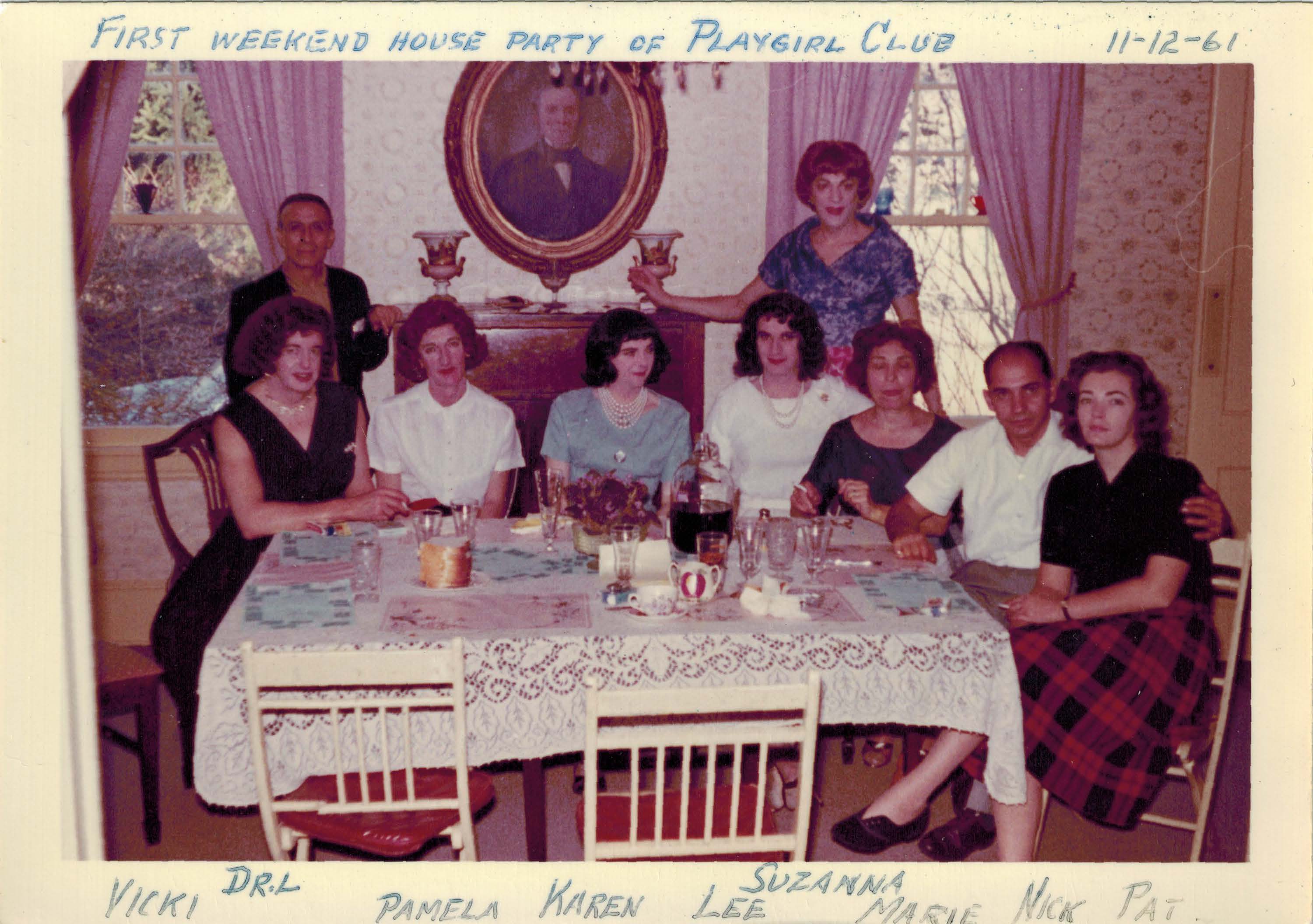 Photographs of Playgirl Club members arranged around a dining table at the first house party.