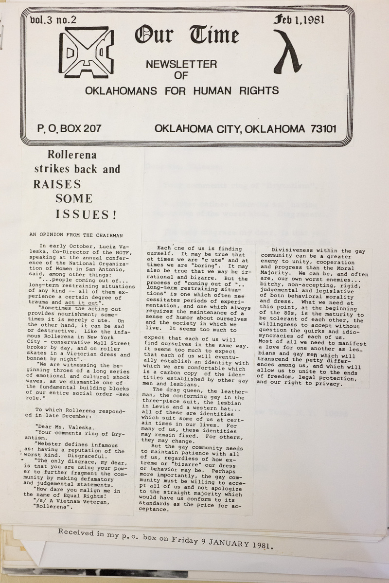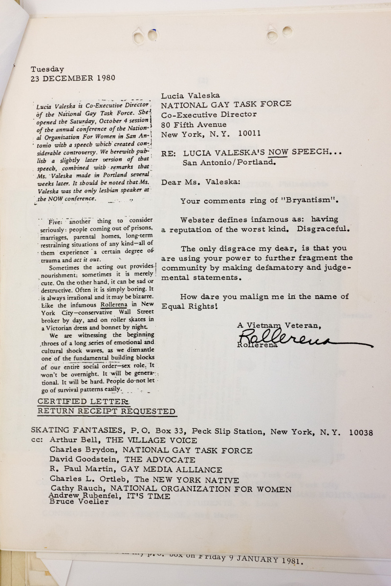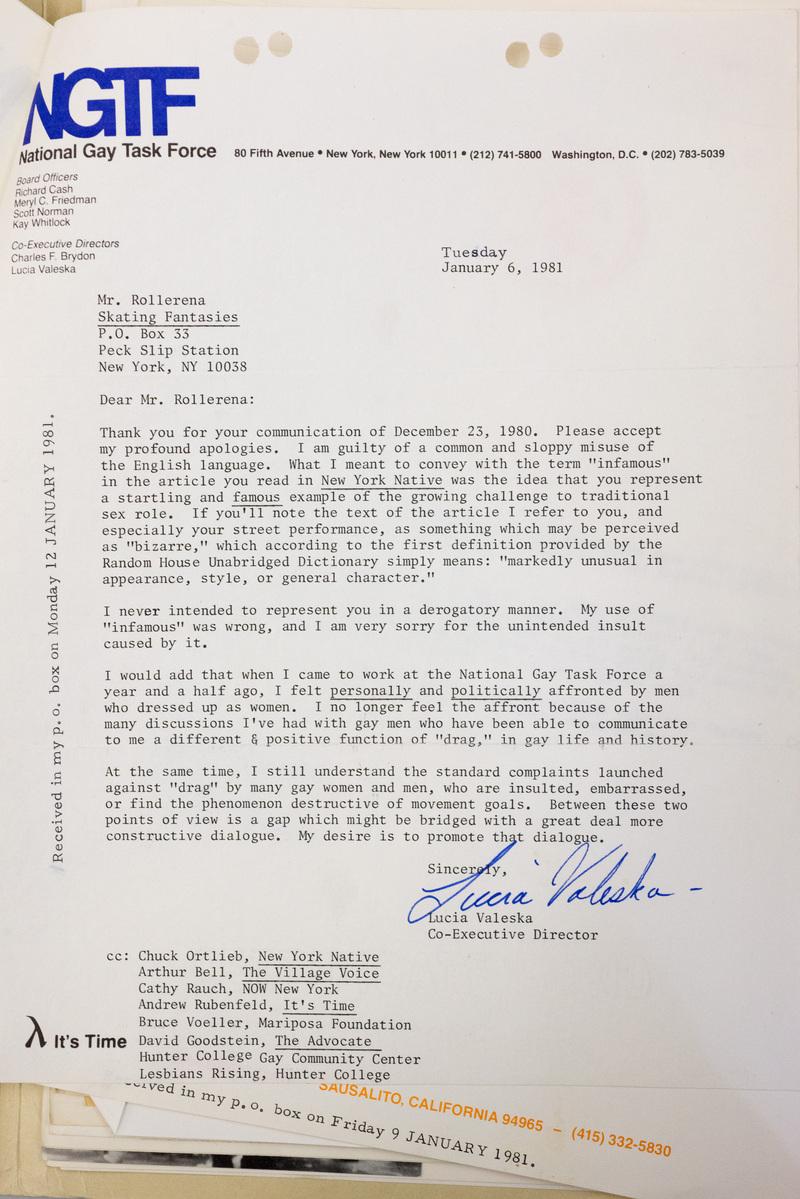 This is a letter written by Rollerena Fairy Godmother in the "Our Time" newsletter to Lucia Valeska in response to her calling Rollerena "infamous" and Valeska's mailed response to Rollerena.