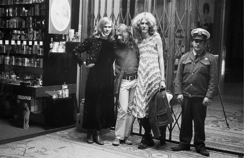 (L to R): Terry Sykes, John Langworthy, Julian Desailly and a security guard, standing outside The Block Arcade. They were attending the Gay Liberation 'Gender confusion dance' which was held at Melburnian Receptions which was located in the basement of The Block Arcade. The Gender Confusion dance was a radical drag/gender fuck event. The photo was used on the front cover of Nation Review newspaper, and related to a photo essay on Gay Pride Week (7-14 Sep 1973).