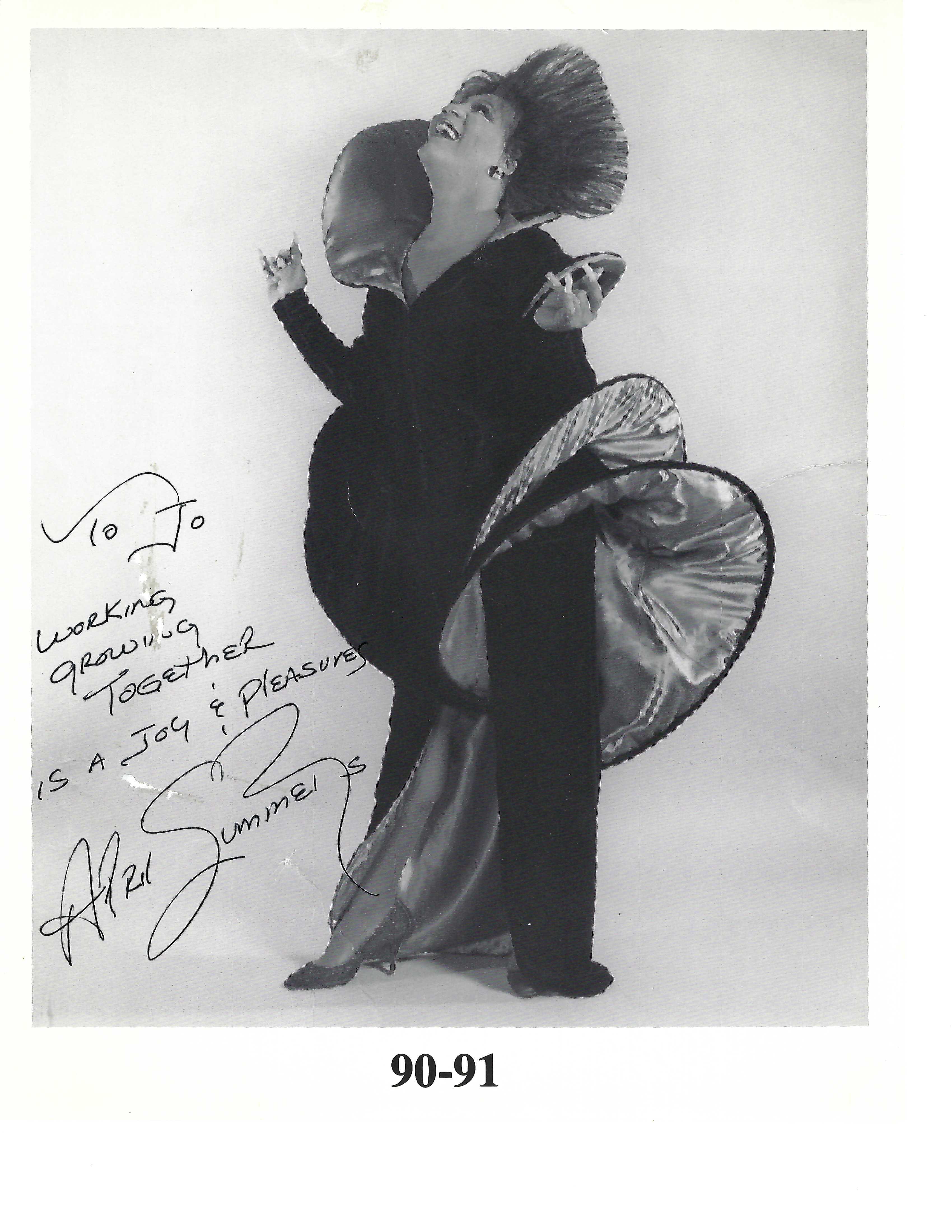 A signed photograph of April Summers wearing an eccentric pantsuit dedicated to someone named Jo.