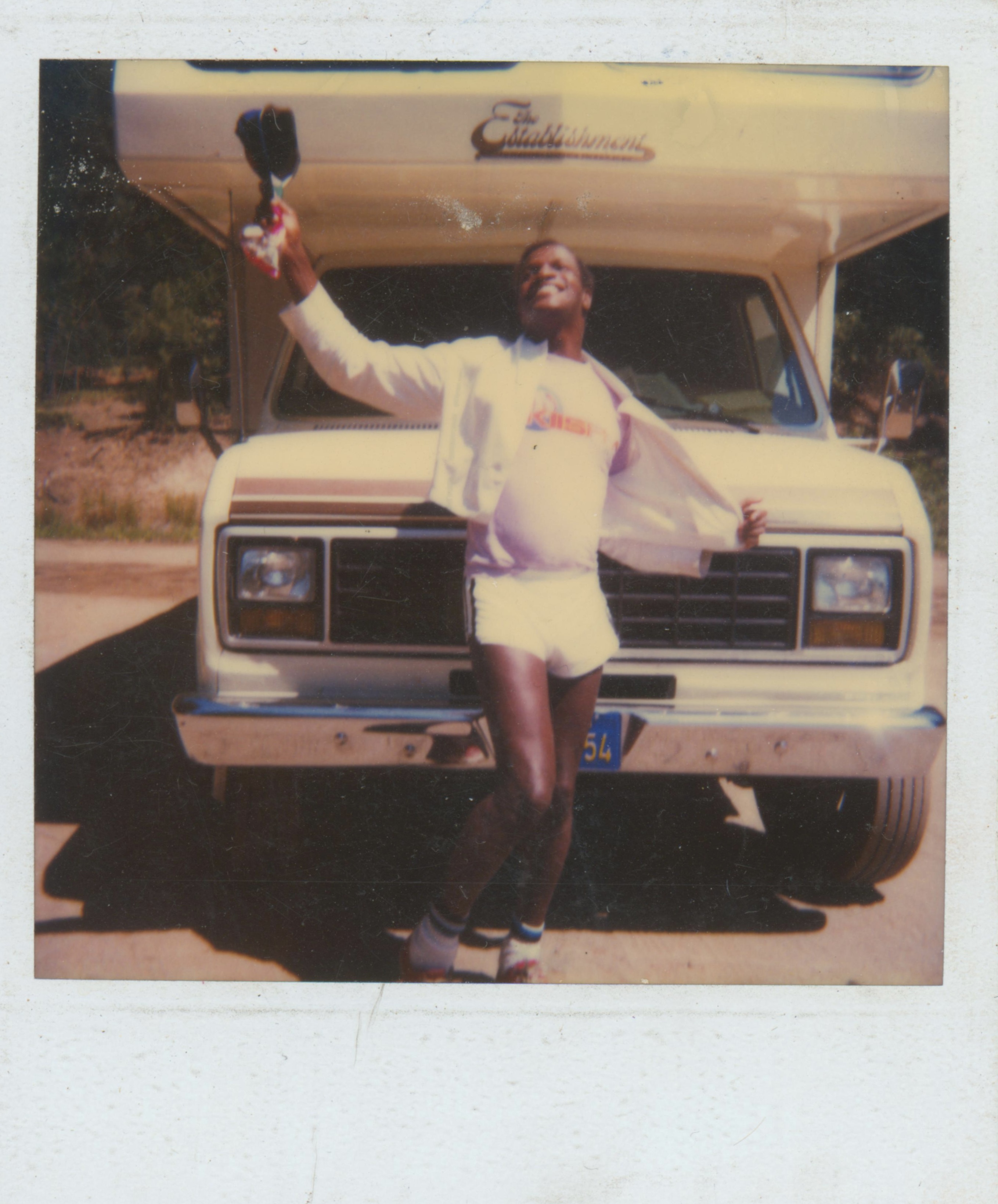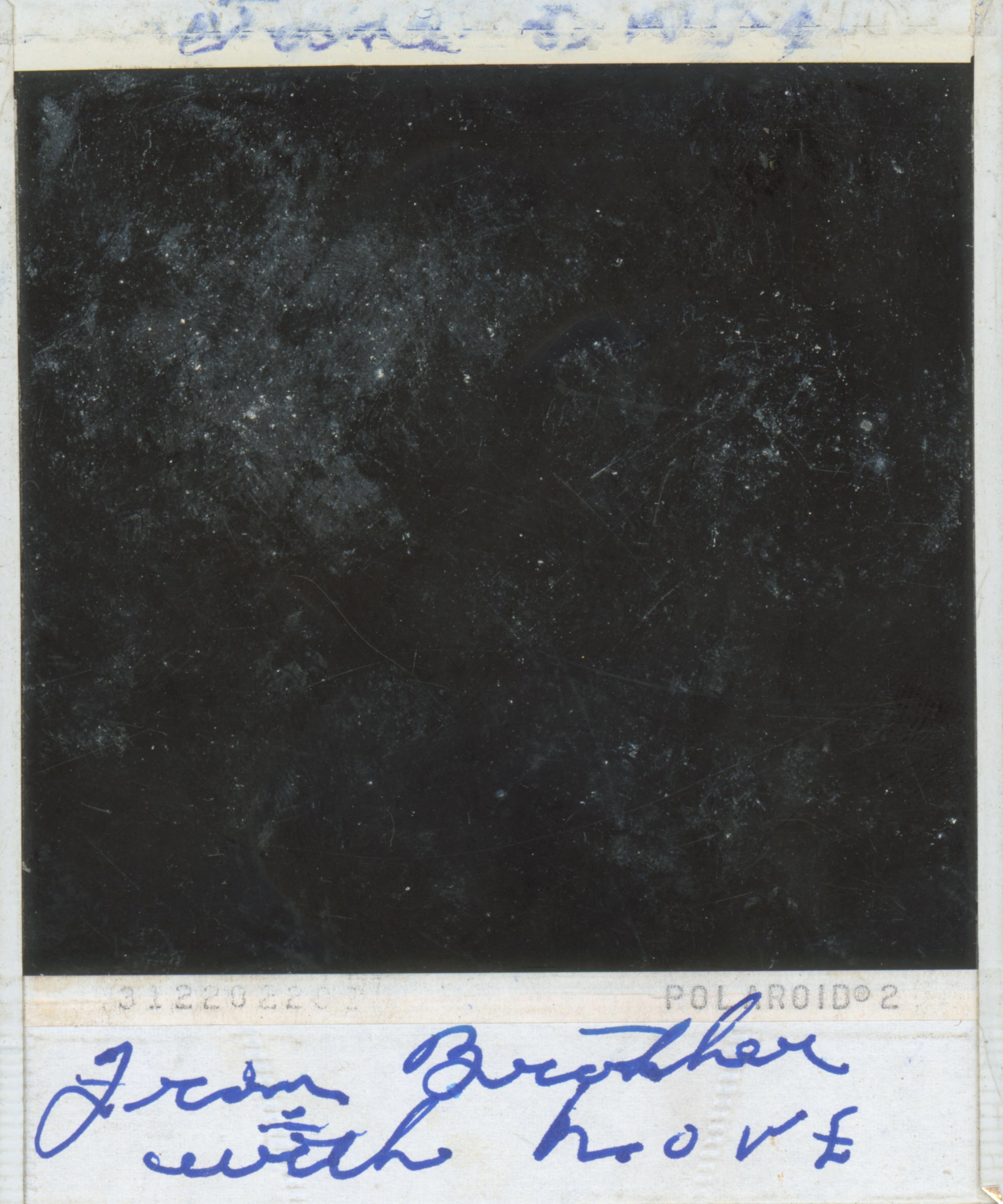 Polaroids of Marsha P. Johnson posing in front of a RV. Marsha is wearing all white and she is smiling. The back reads: "From Brother with Love".