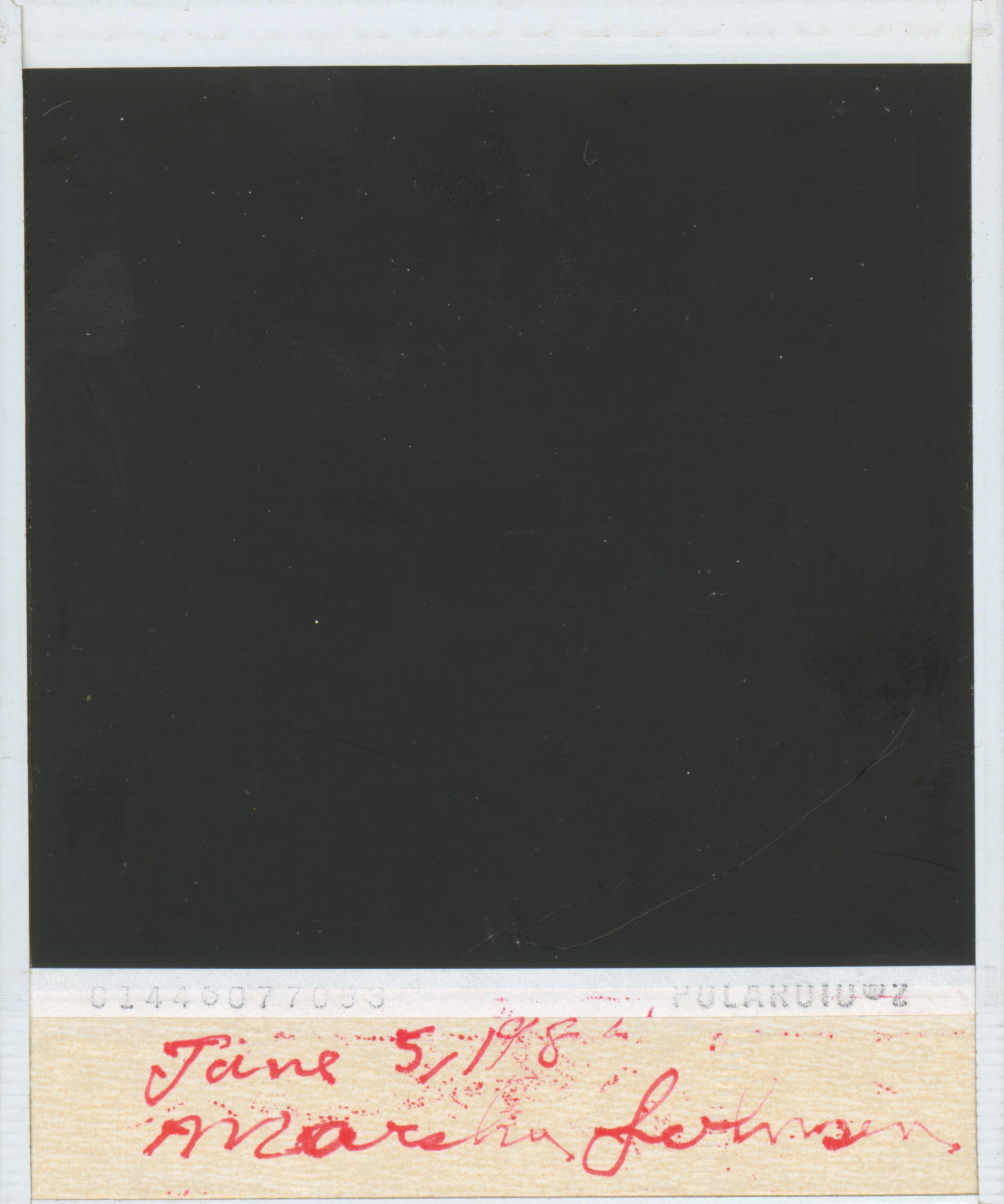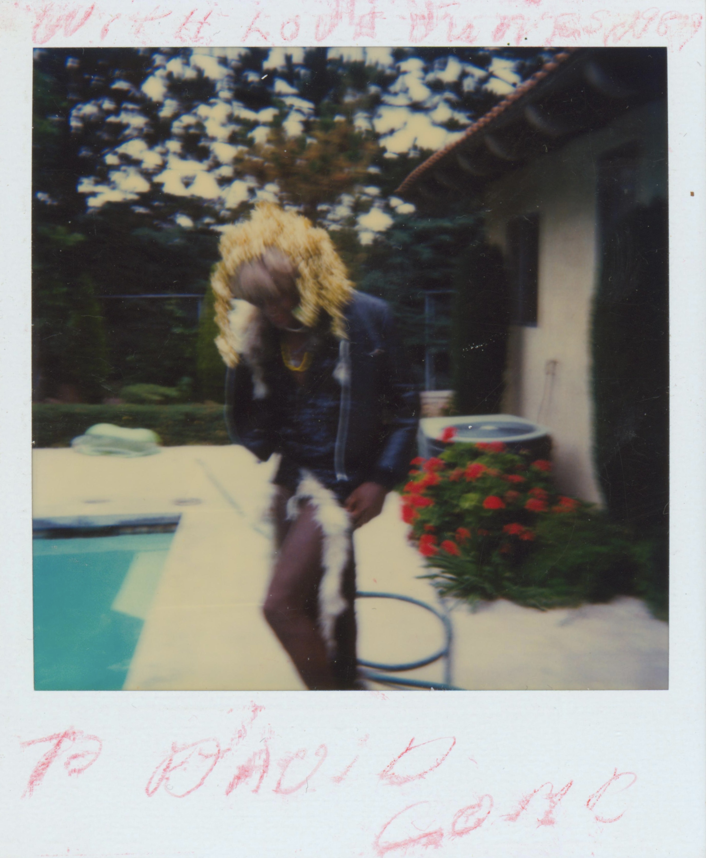 A Polaroid of Marsha P. Johnson wearing yellow tinsel on her head with a blonde wig and a navy blue outfit. She’s looking down, standing in a backyard with a pool. On the front of the Polaroid, it reads "To David Comb [sic]," who was Randy Wicker’s partner. On the back it reads "June 5, 1984, Marsha Johnson."