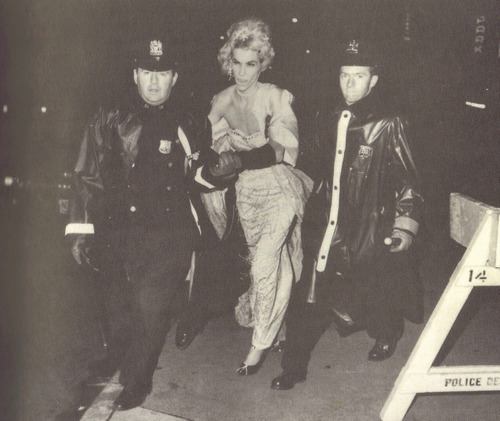 An image capturing an event where 44 cross-dressed people, some of whom were transgender, were arrested for "indecent exposure" and "masquerading" as a result of a police raid at the National Variety Artists Exotic Carnival and Ball in Manhattan Center. October 26, 1962.
