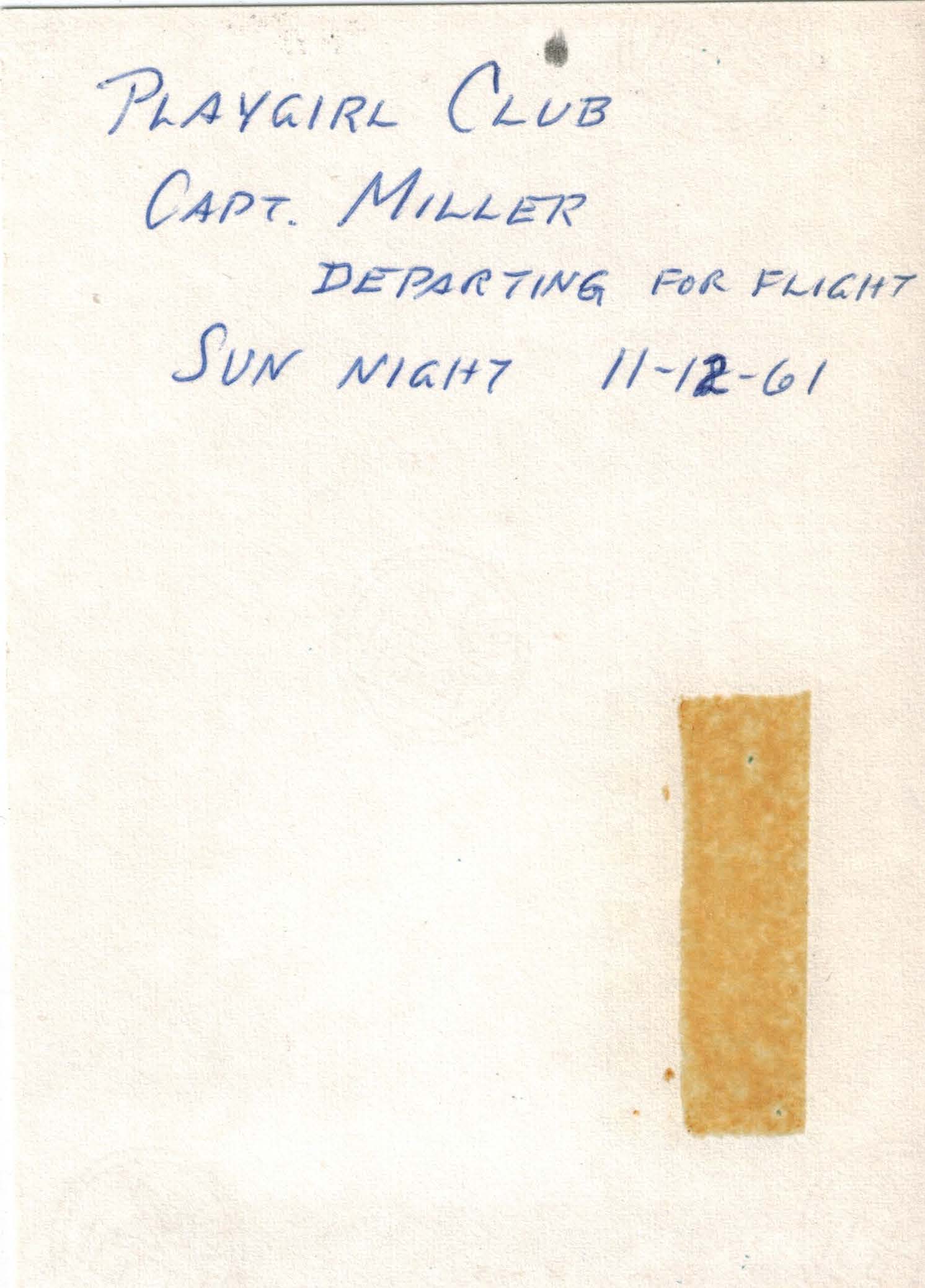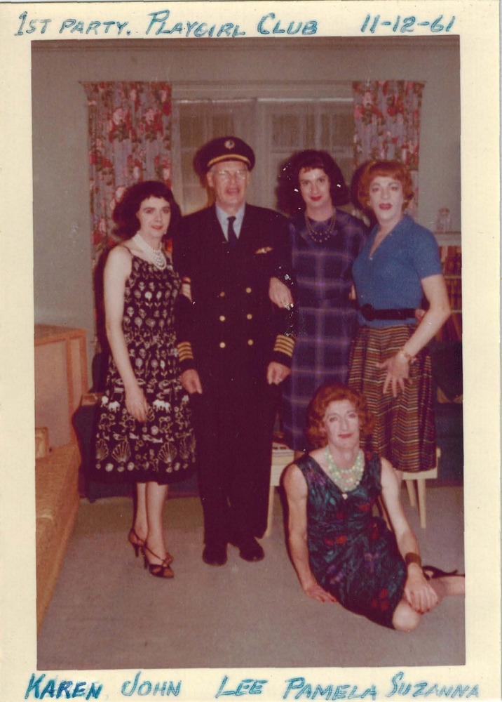 A photograph of Karen, John Miller, Lee, and Pamela standing with their arms linked and Suzanna posed on the floor in front of them. Captain John Miller, who also went by Felicity Chandelle, is wearing his pilot uniform because he had to leave for a flight.