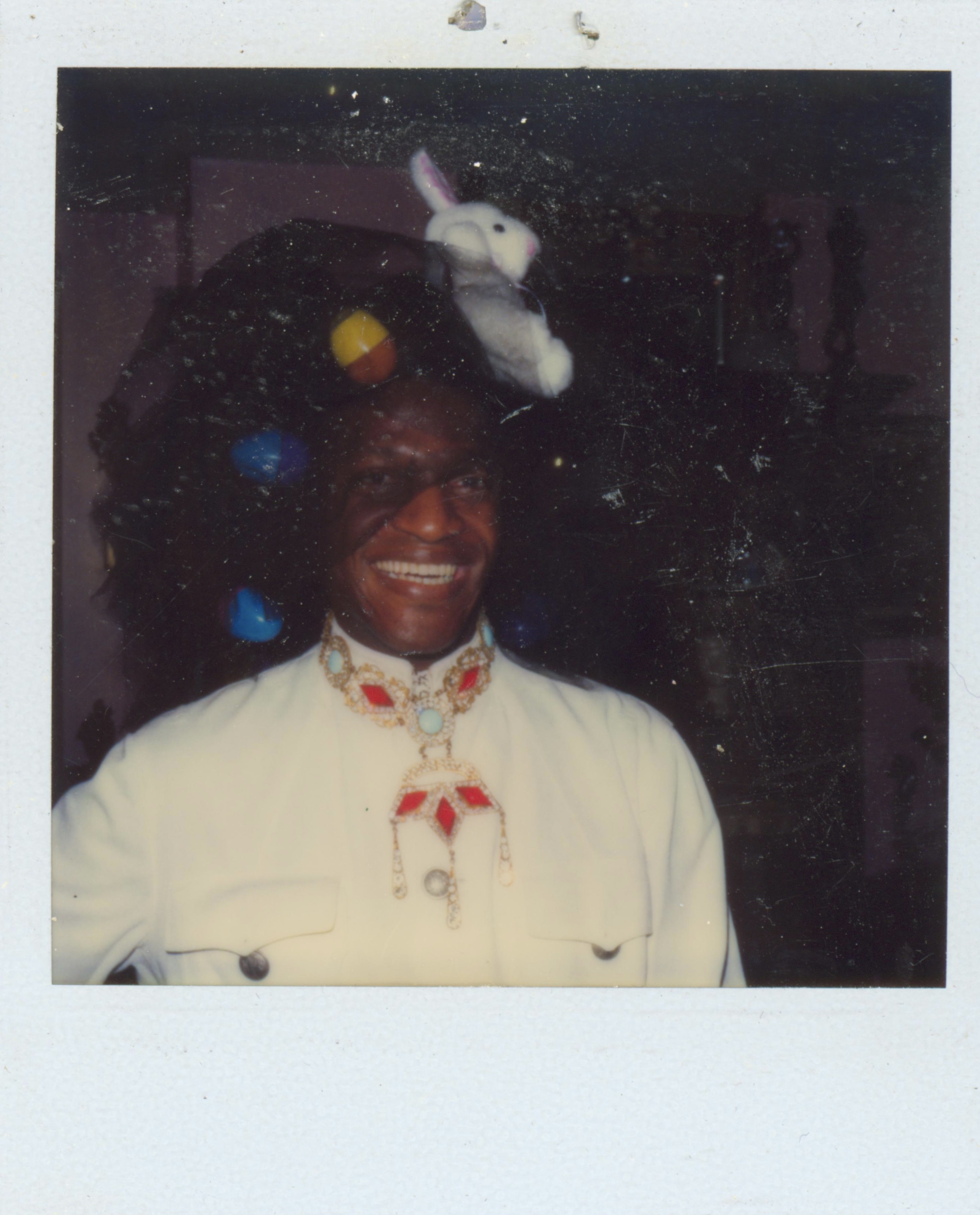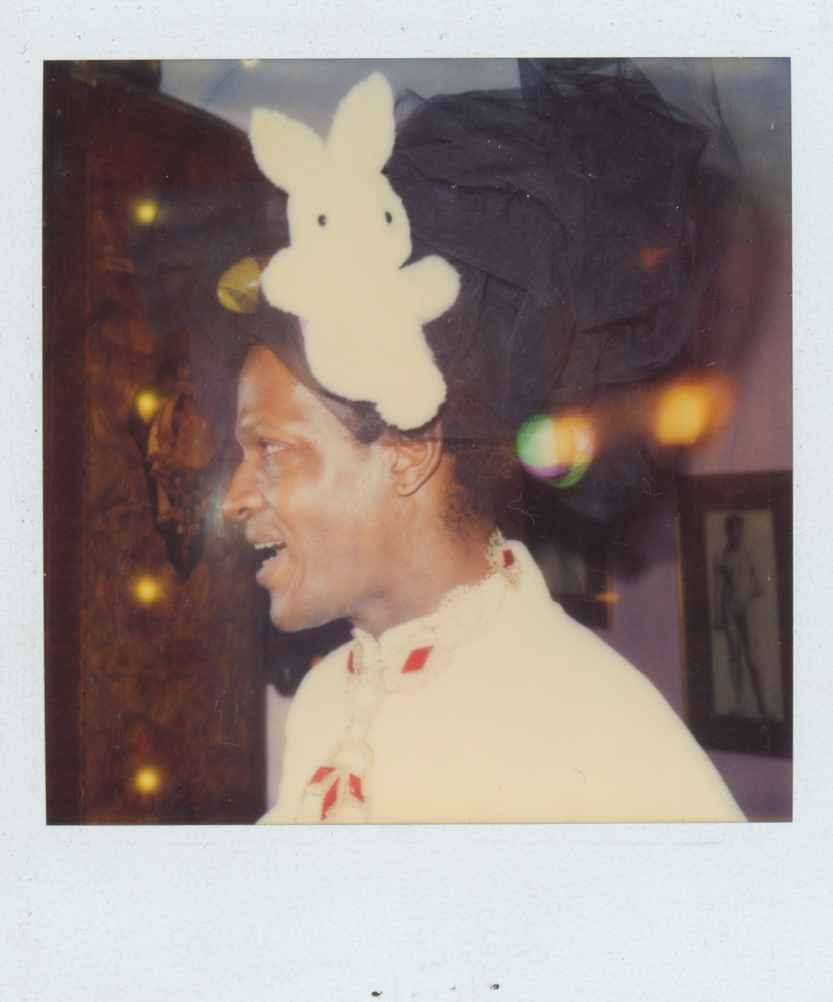Polaroids of Marsha P. Johnson wearing a black tulle headpiece that has a stuffed bunny toy attached to it. She’s also wearing a white top and a silver necklace with red and blue gems.