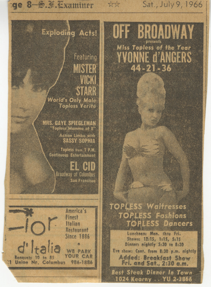 1966 advertisement for El Cid, a topless club in San Francisco's North Beach, featuring Victoria Fernandez, who performed as Vicki Starr. Fernandez, a trans woman, is misgendered in her top billing as the "World's Only Male Topless Verité." This type of exoticizing language was often used to advertise her performances.