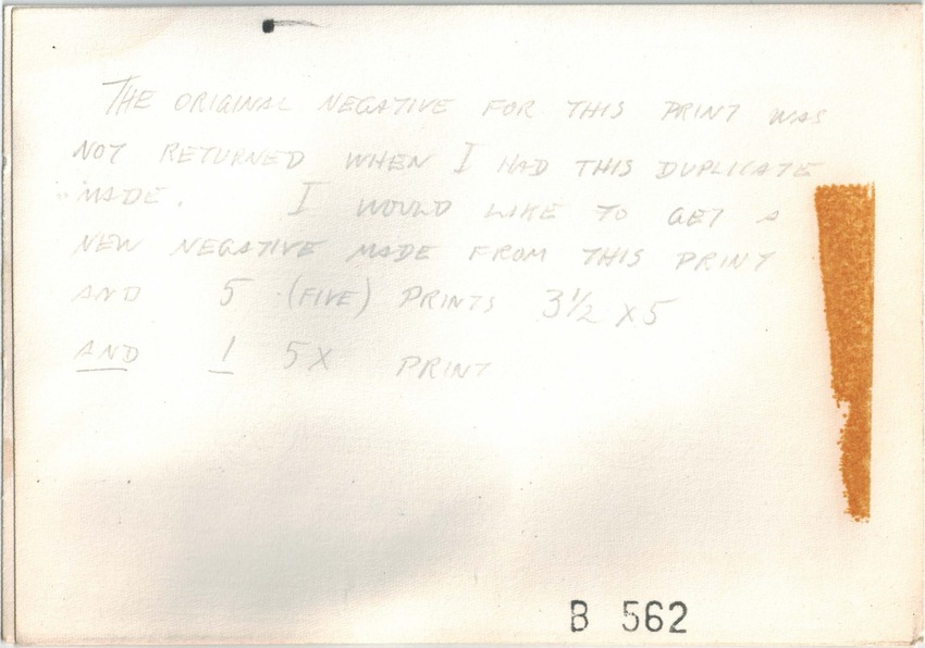 A photograph of Felicity Chandelle standing outside in a plaid skirt suit and fur shawl. There is a handwritten note on the back reads, "The original negative for this print was not returned when I had this duplicate made. I would like to get a new negative made from this print and 5 (five) prints 3 1/2 x 5 and 1 5x print."