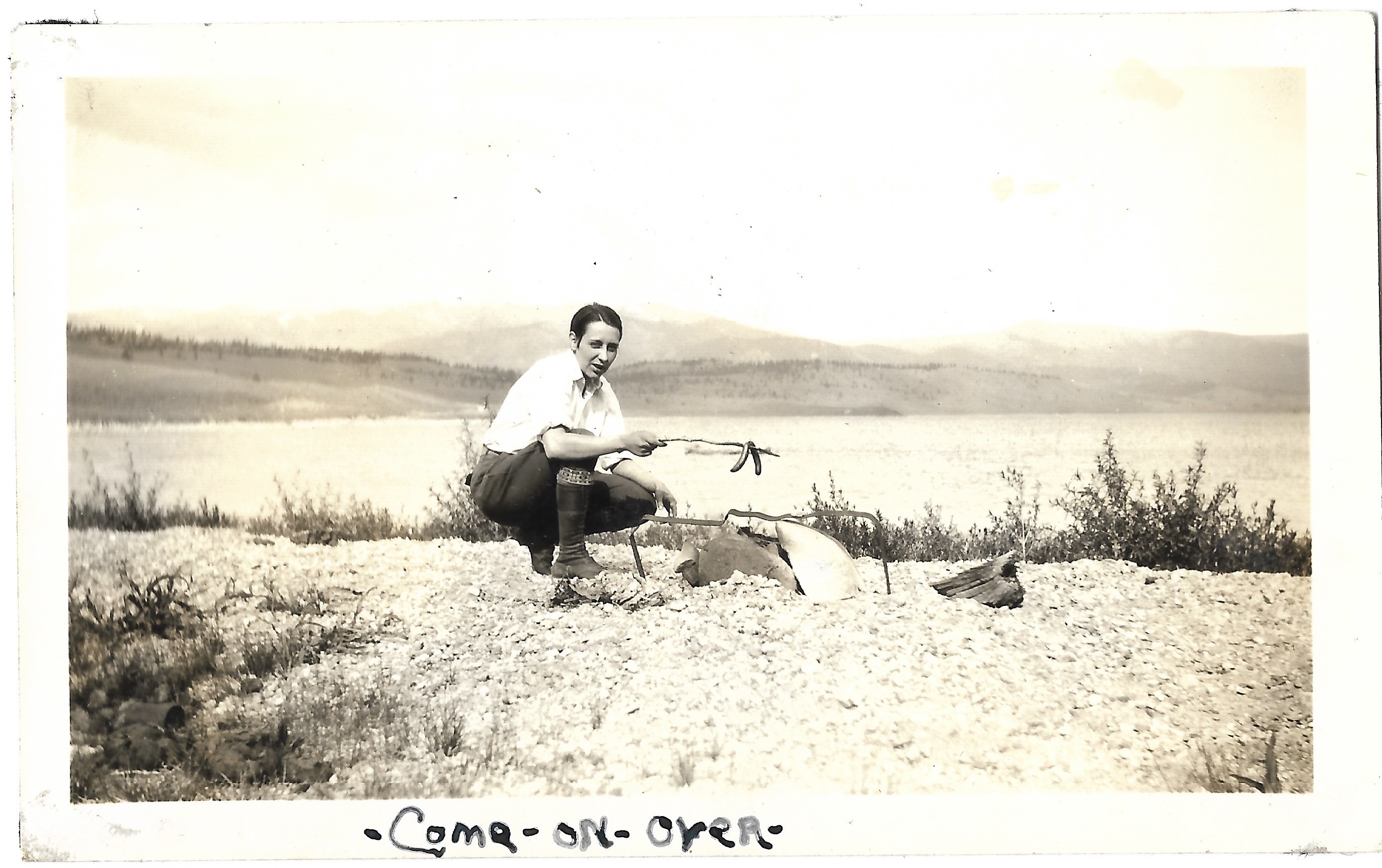 A photograph of Dorris Bullard taken in Twin Lakes, Colorado. The image is captioned "Come on Over."