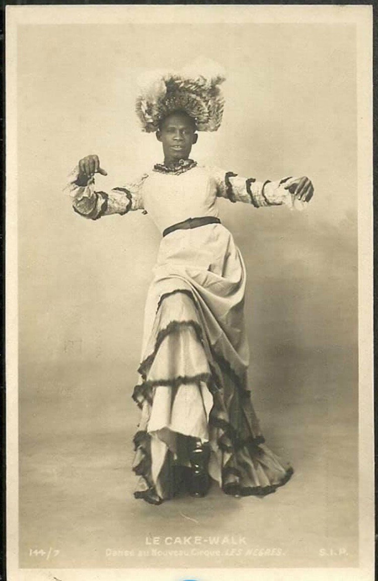Jack Brown poses in drag facing the camera with arms outstretched and one leg lifted. He wears a large, ruffled hat and a light colored tiered dress with dark ruffles and trim. The bottom of the postcard reads: Le Cake-Walk Dansé au Nouveau Cirque LES NÉGRES. Brown performed as a female impersonator for almost a year in Paris before traveling to and performing in various countries over several years.