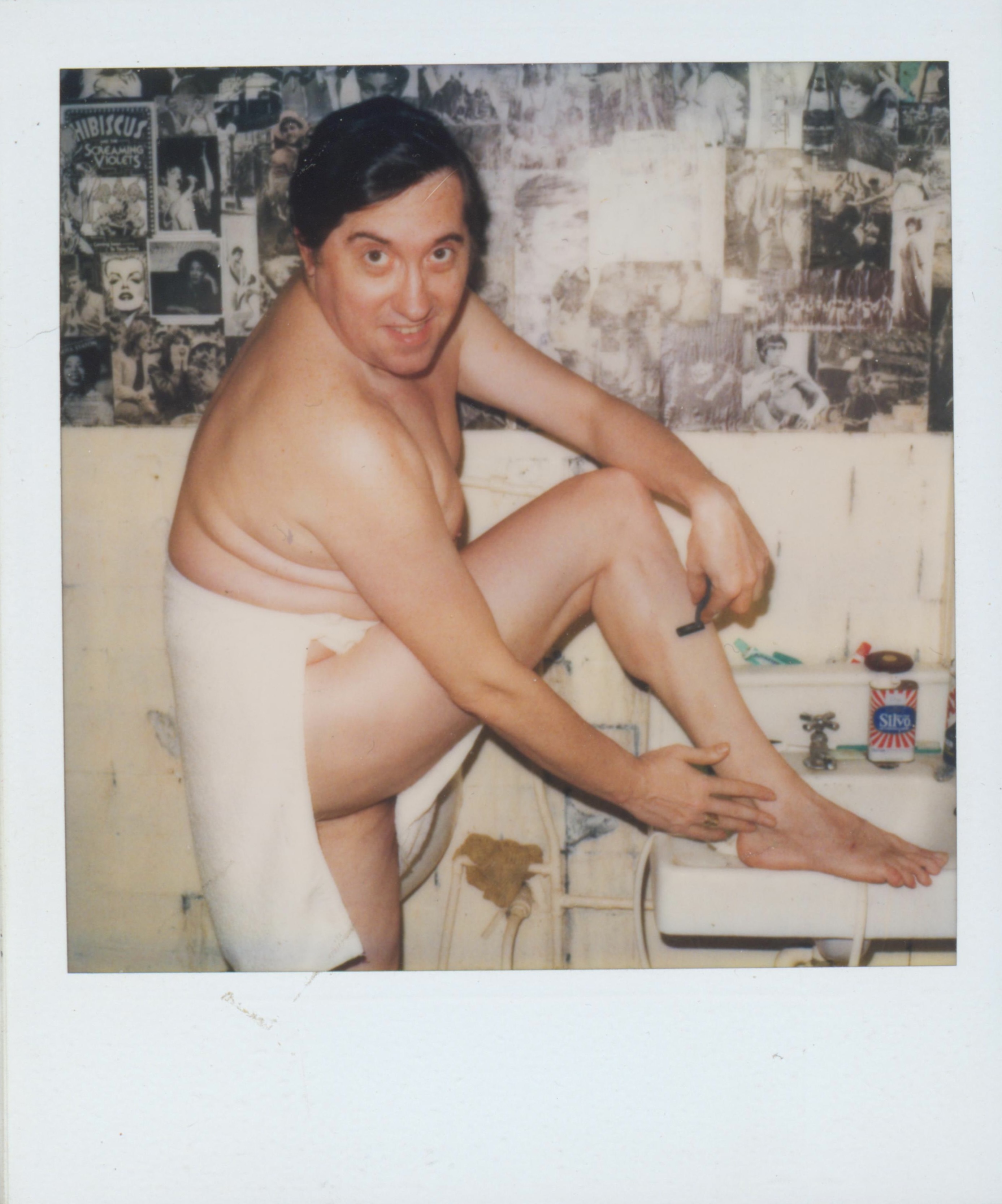 A photograph of Guillermo Knight, wearing a towel and standing by a sink holding a razer. The back of the photo reads "PR 1986."
