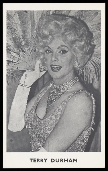 Terry Durham is wearing a sparkly dress and necklace; holding a feathered fan with his white-gloved hand, glancing towards the viewer. Terry Durham, known as a drag performer in the 1960s, was a transsexual woman, one of the first in the UK to undergo breast implants and hormone treatment