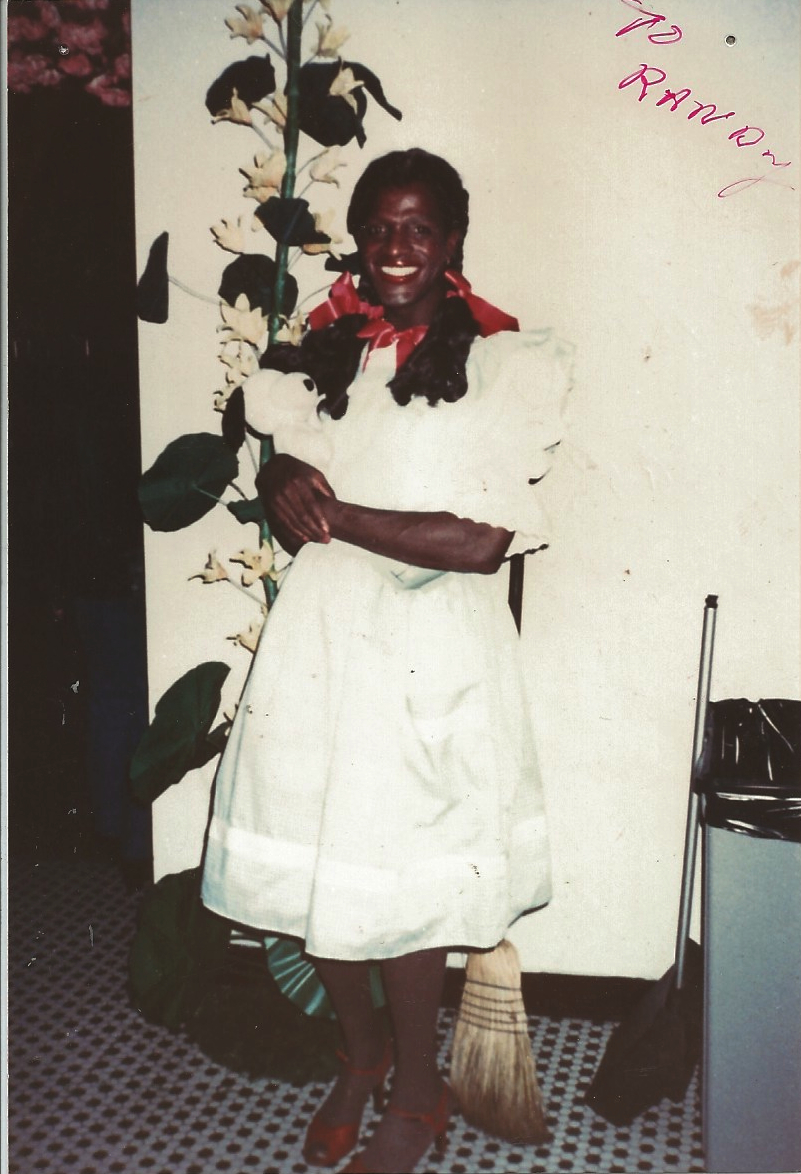 A photograph of Marsha P. Johnson dressed as Dorothy from the Wizard of Oz. Marsha is wearing red shoes, a white dress, and pigtails with red ribbons. Marsha is also holding a stuffed dog and is standing in front of a broom and fake flower stalk. The image is signed: "To Randy."