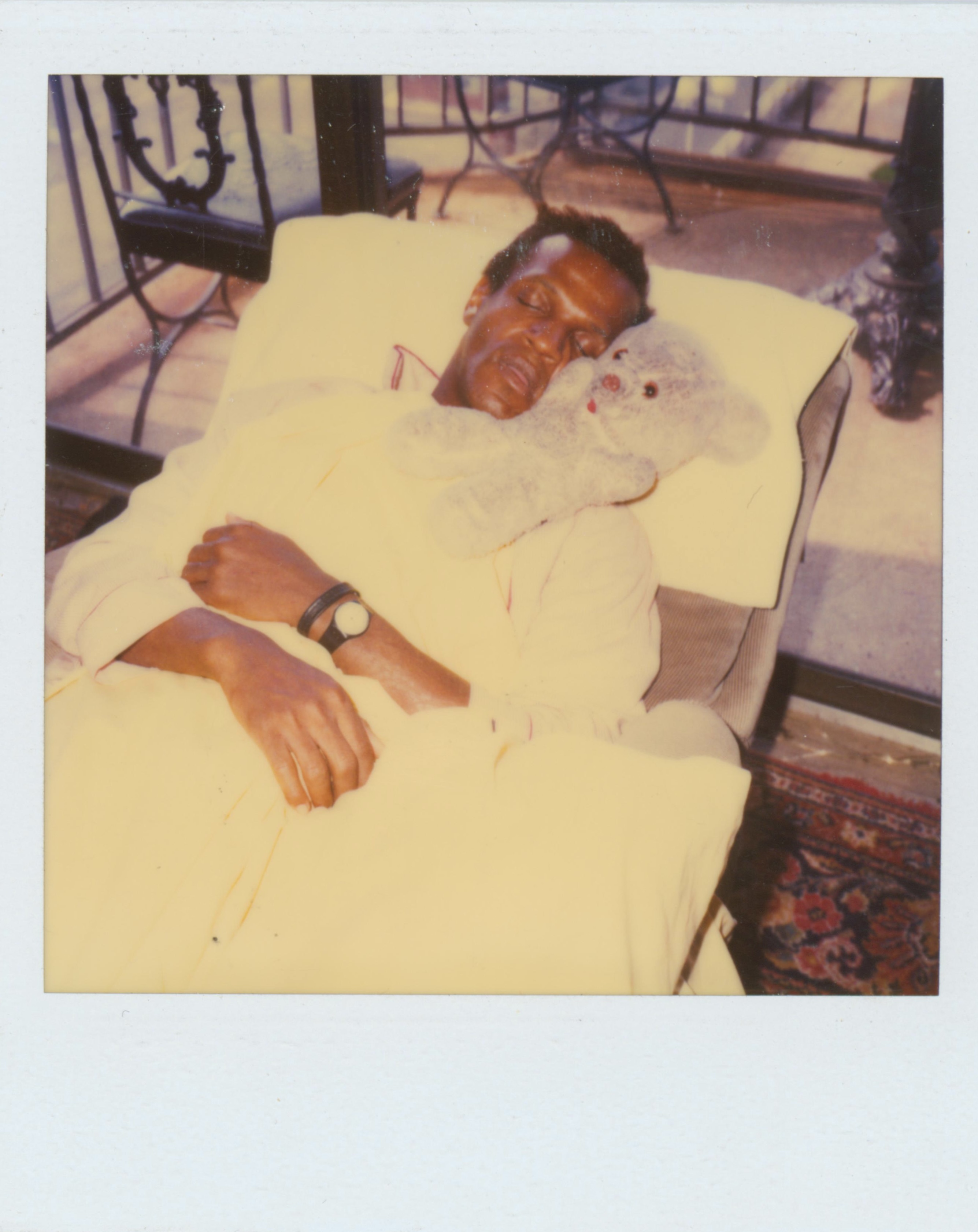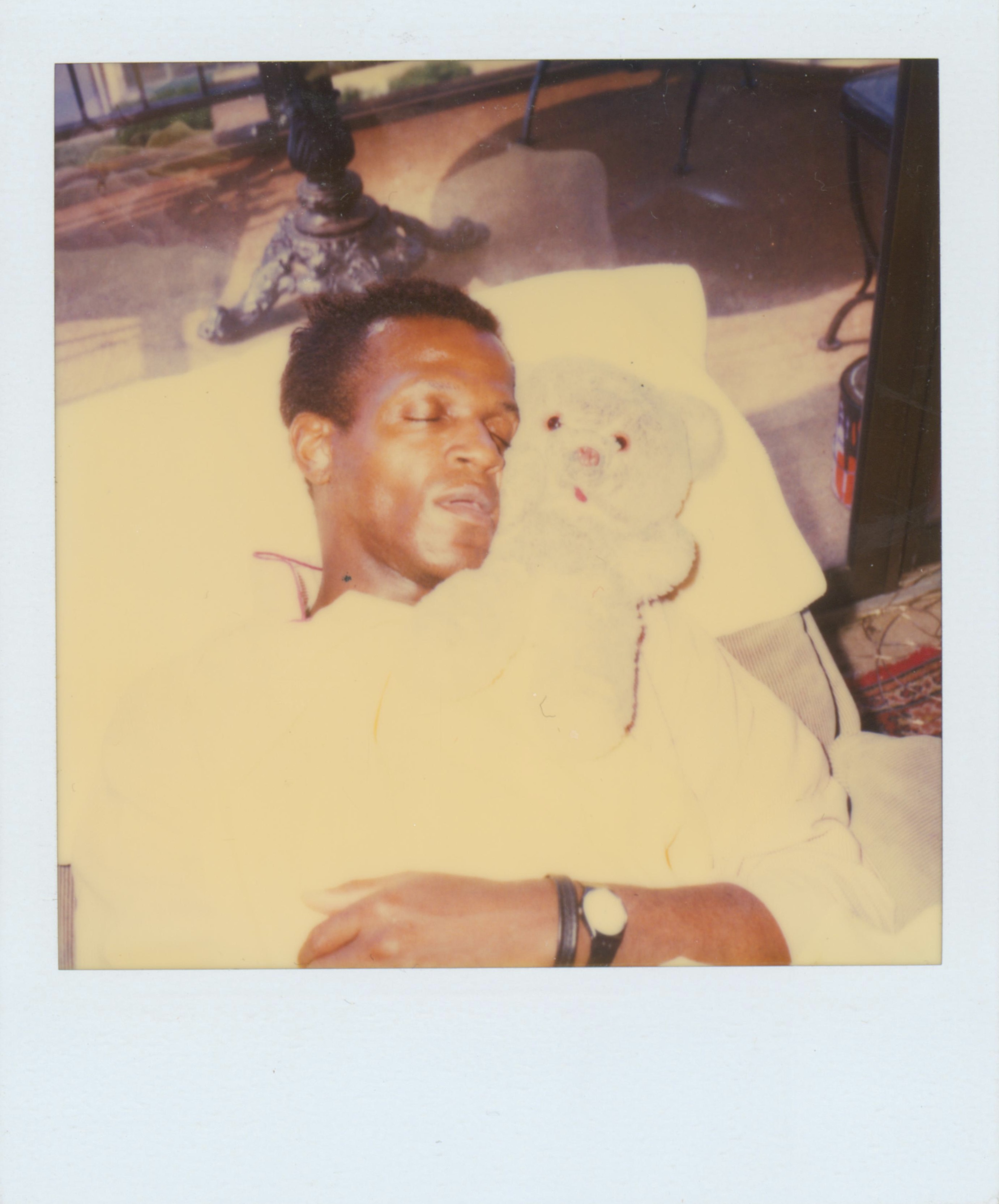 Polaroids of Marsha P. Johnston lying on a recliner in pajamas. Marsha is snuggling a teddy bear.