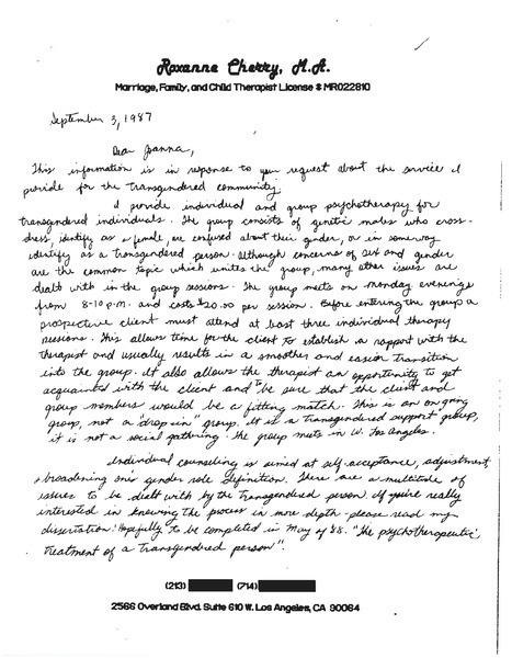 Letter from Roxanne Cherry to Joanna Clark (also known as Sister Mary Elizabeth) describing the services Roxanne provides for the transgender community, which include group therapy and individual therapy sessions. Roxanne also describes the process by which an individual can become a part of the group therapy session. At the end of the letter Roxanne provides a telephone number in case anyone would like more information. The letter also includes handwritten instructions to route the letter to Rupert Raj, Phoebe, Joanna Clark, and others.