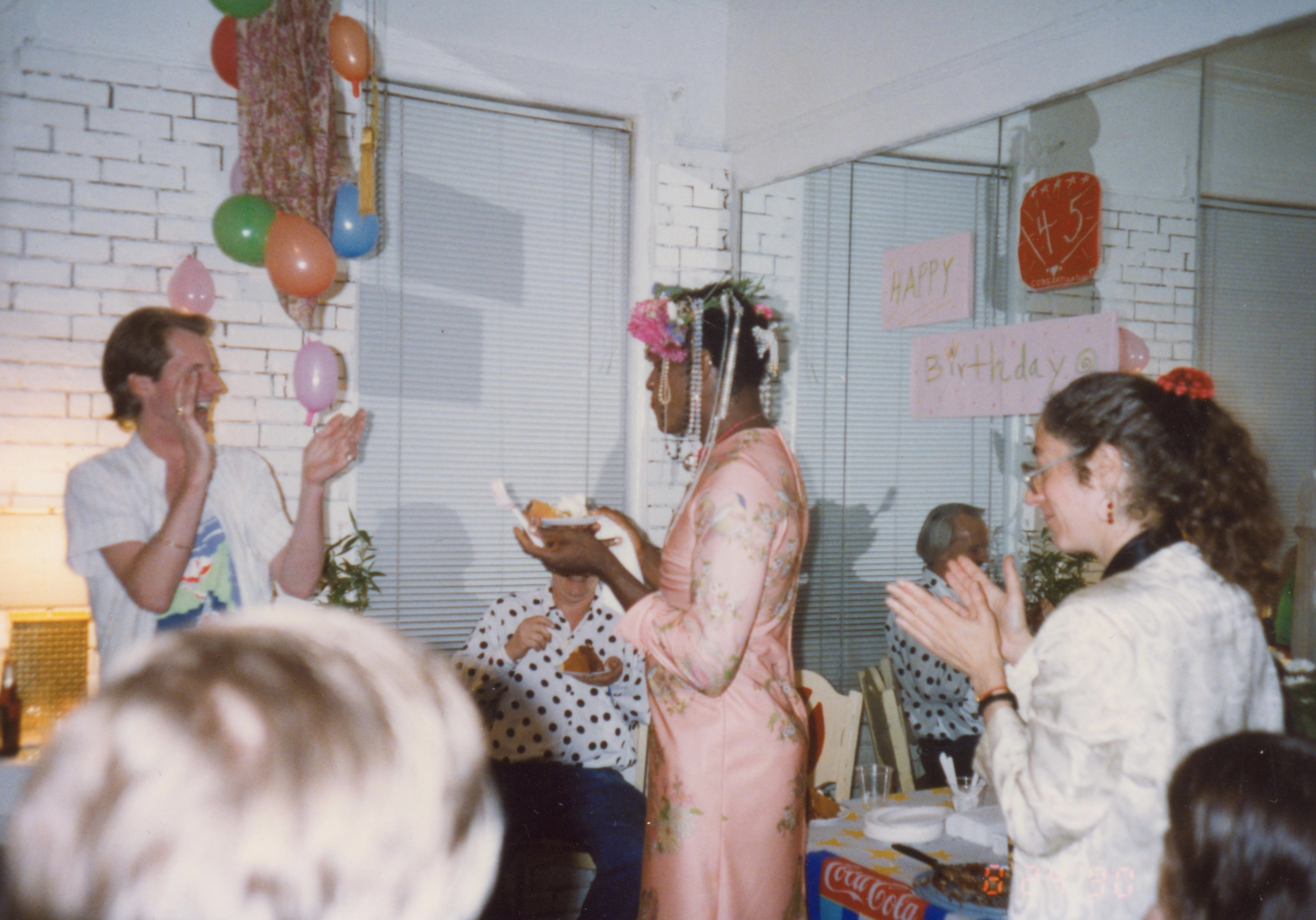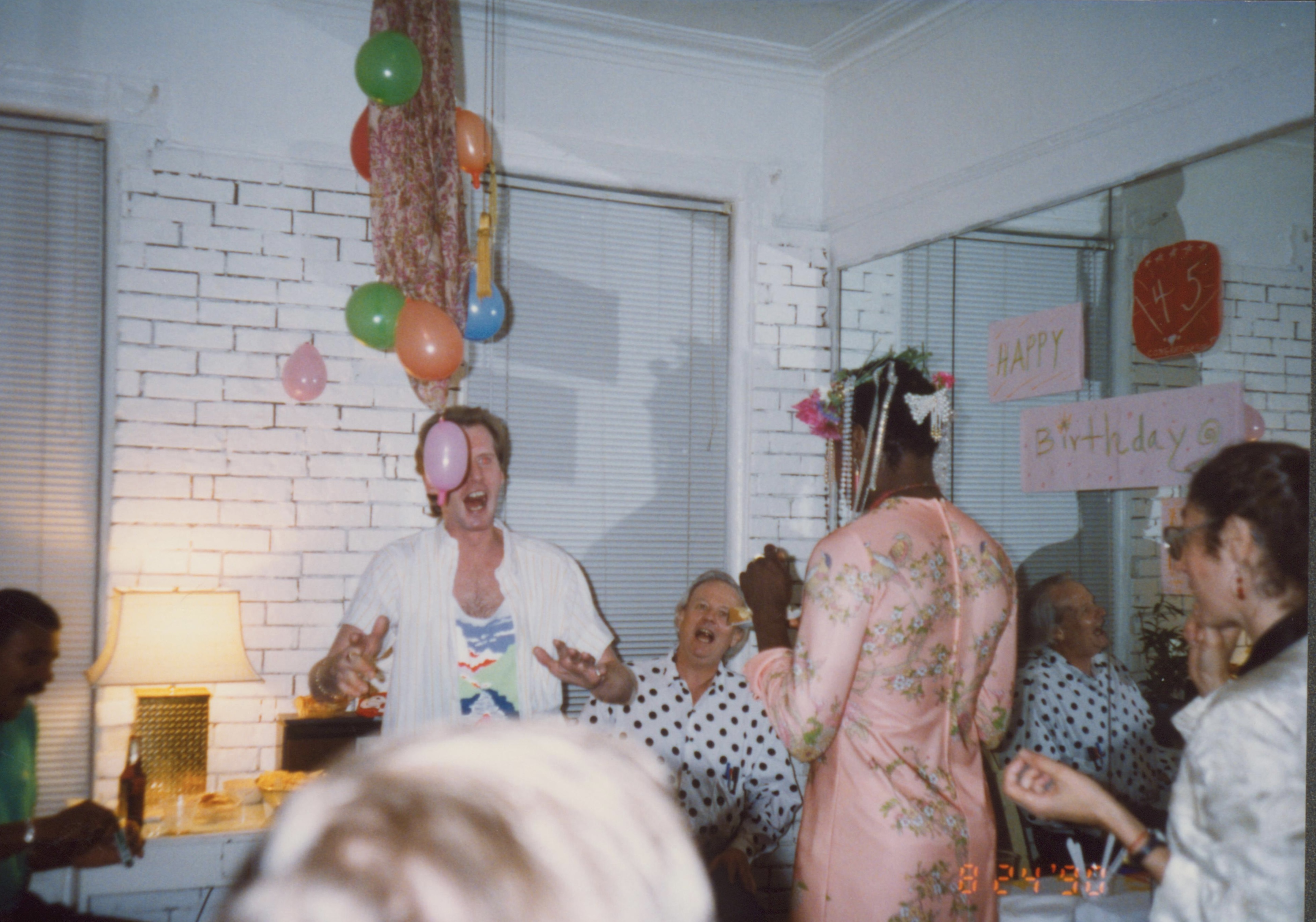 Photographs of Marsha P. Johnson eating cake at her birthday party surrounded by friends. These friends include George Flimlin wearing a white shirt and colorful patterned tank top, Randy Wicker sitting down in the polka shirt, and her friend only known as Judy wearing a white blazer. They’re all in front of a mirror which has signs taped to it that read “Happy Birthday” and the number “45.” Balloons hang down from the ceiling.