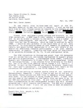 Letter from Theodore I. Friedman to Rupert Raj explaining his disappointment that his publication, Gender Issues Newsletter, is no longer going to be published. He does say that he's happy to help Rupert as an advisor and may be able to meet him at the Orthopsychiatric Association meeting in Toronto.