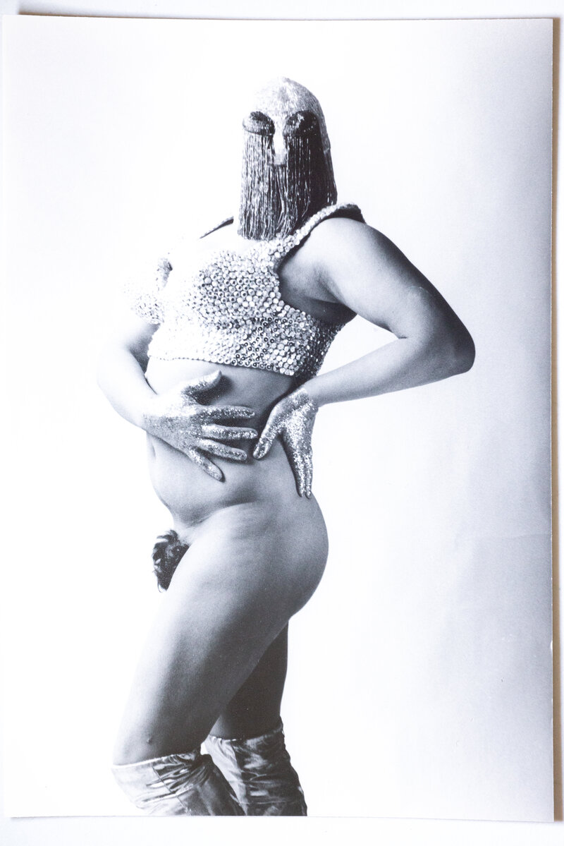 This is a photograph of Leigh Bowery wearing a mask taken by Lizzerd Soufflé.