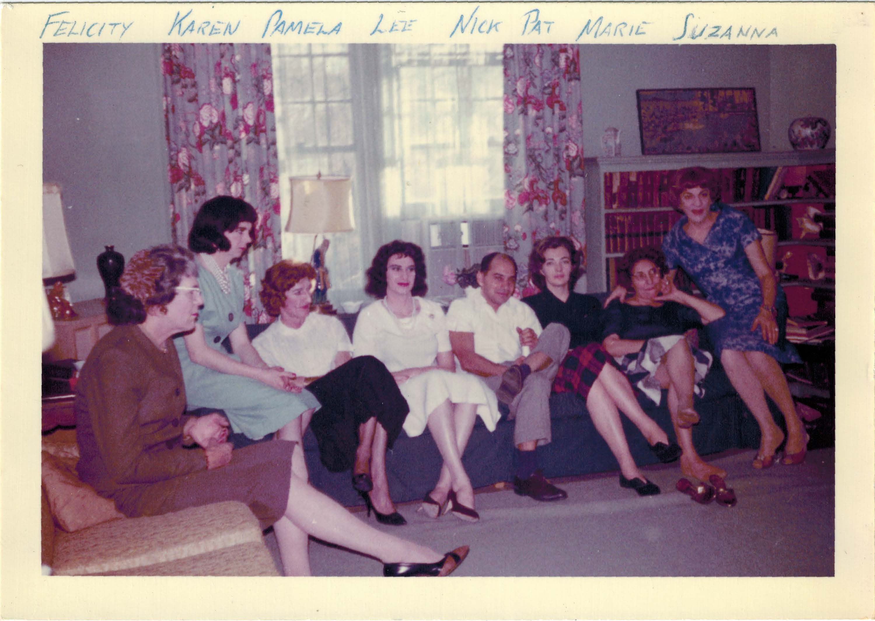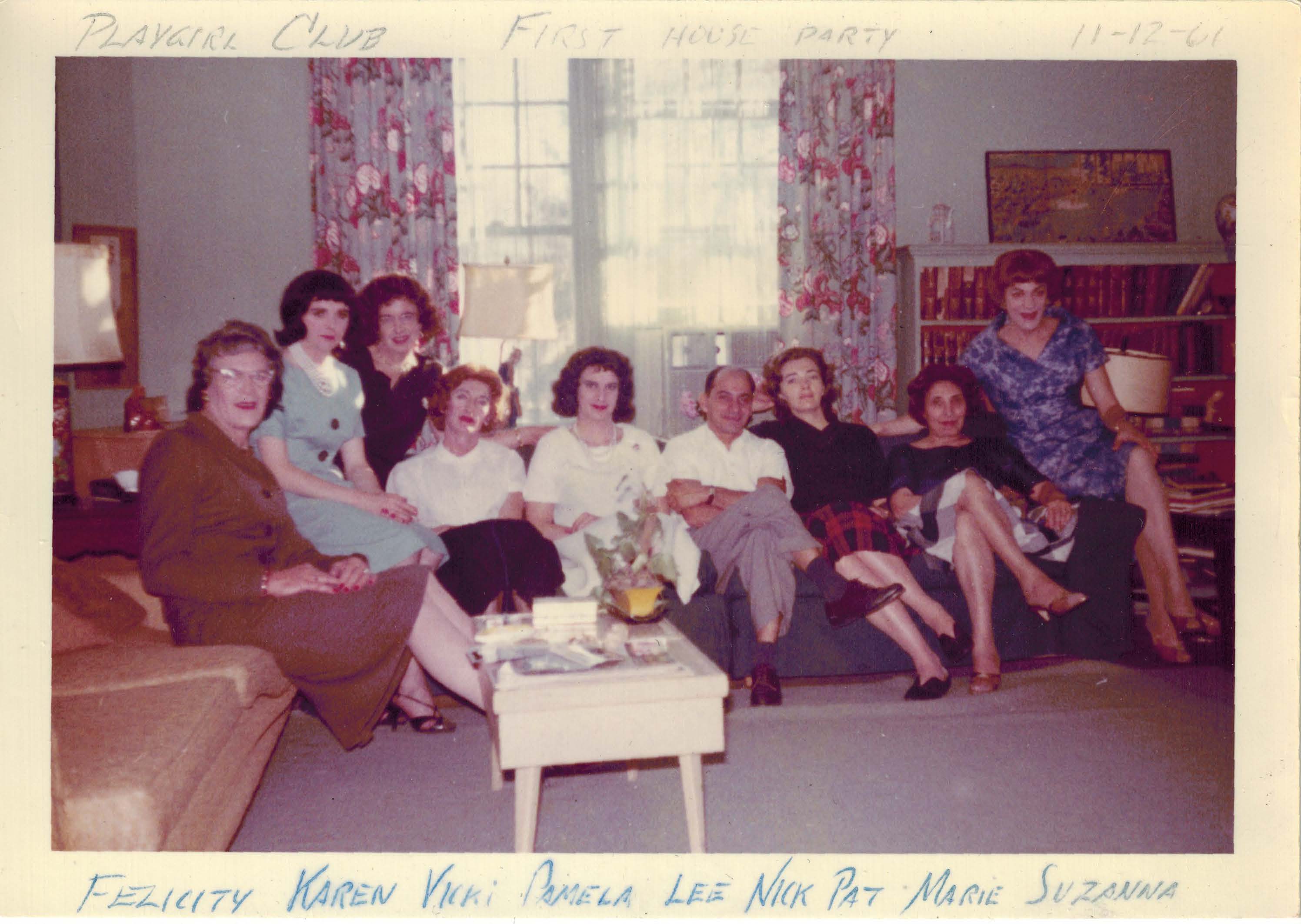 A photograph of Playgirl Club members Felicity, Karen, Vicki, Pamela, Lee, Nick, Pat, Marie, and Suzanna (left to right) seated together at the first house party.