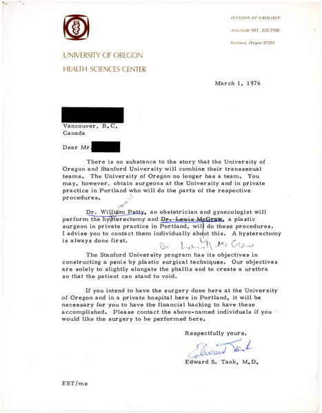Letter from Edward Tank to Rupert Raj stating that the University of Oregon and Stanford University are not combining transgender medical teams, and that the University of Oregon no longer has a team. Tank explains that surgeons of the university in private practice can do some gender affirming surgeries.