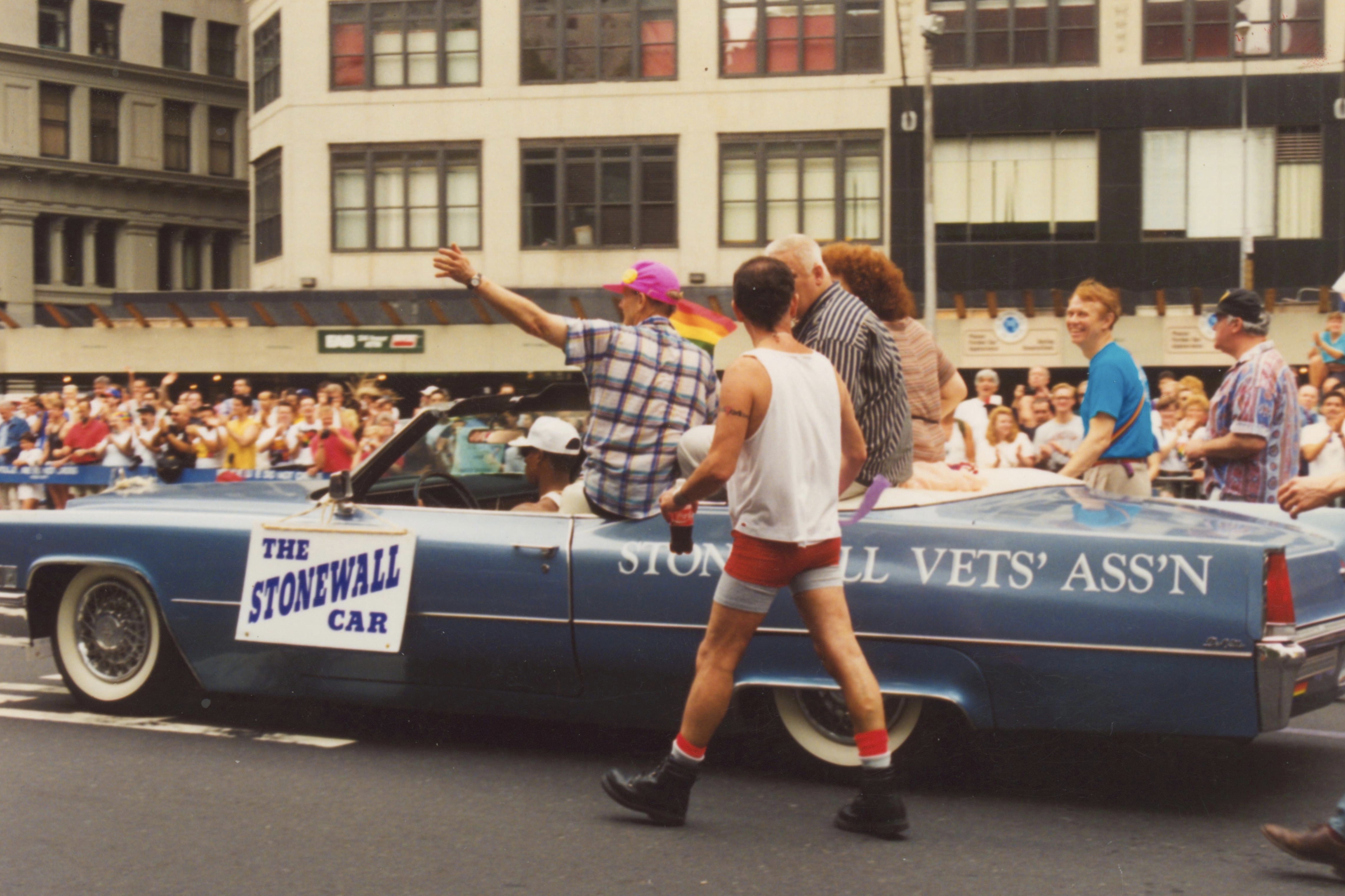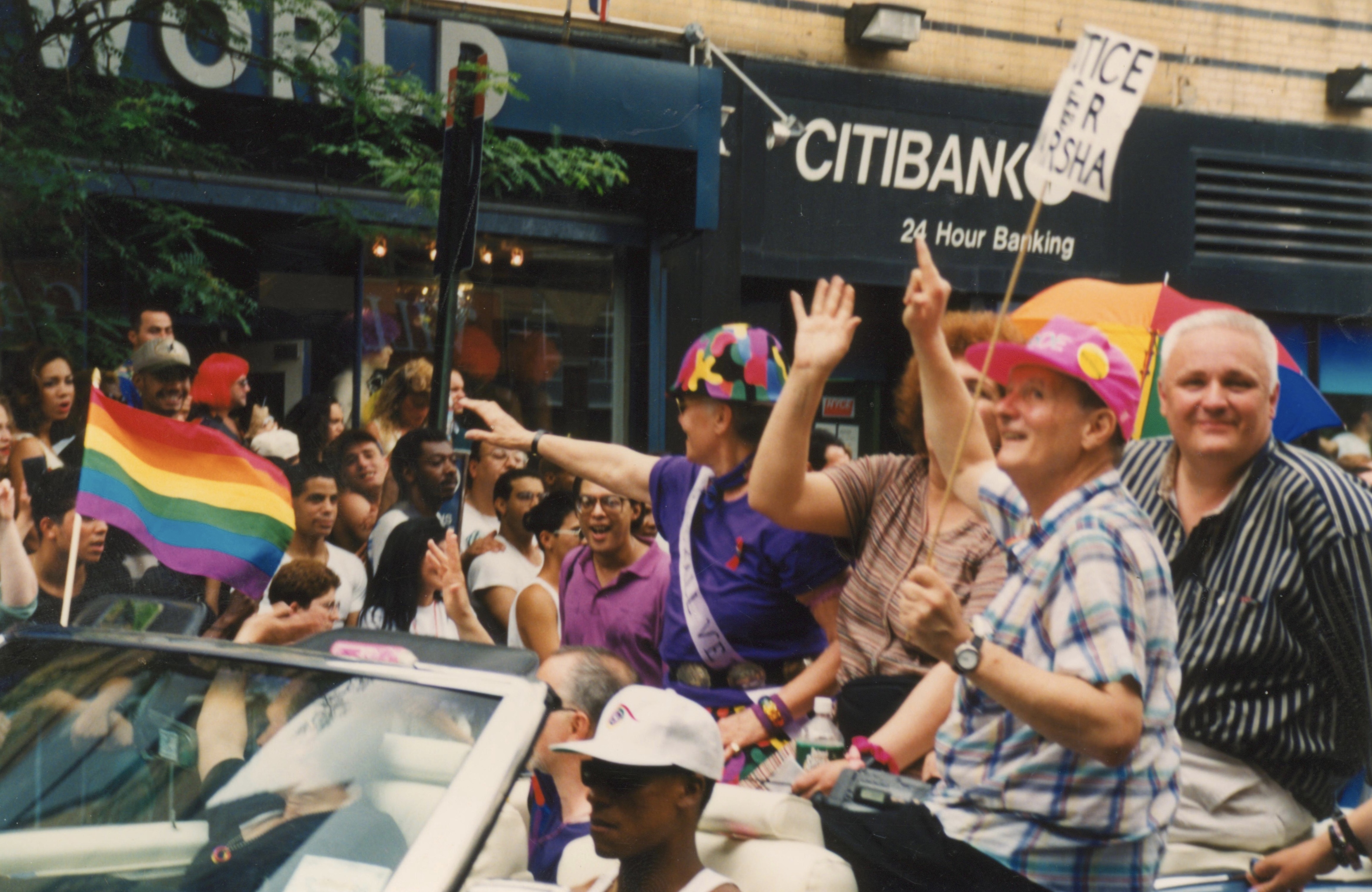 A photograph of Stormé DeLarverie sitting on the back of a convertible waving out at a crowd wearing a multicored hard hat, purple shirt, and a sash that reads "Stonewall Vet." Randy Wicker holds a sign that says "Justice for Marsha."