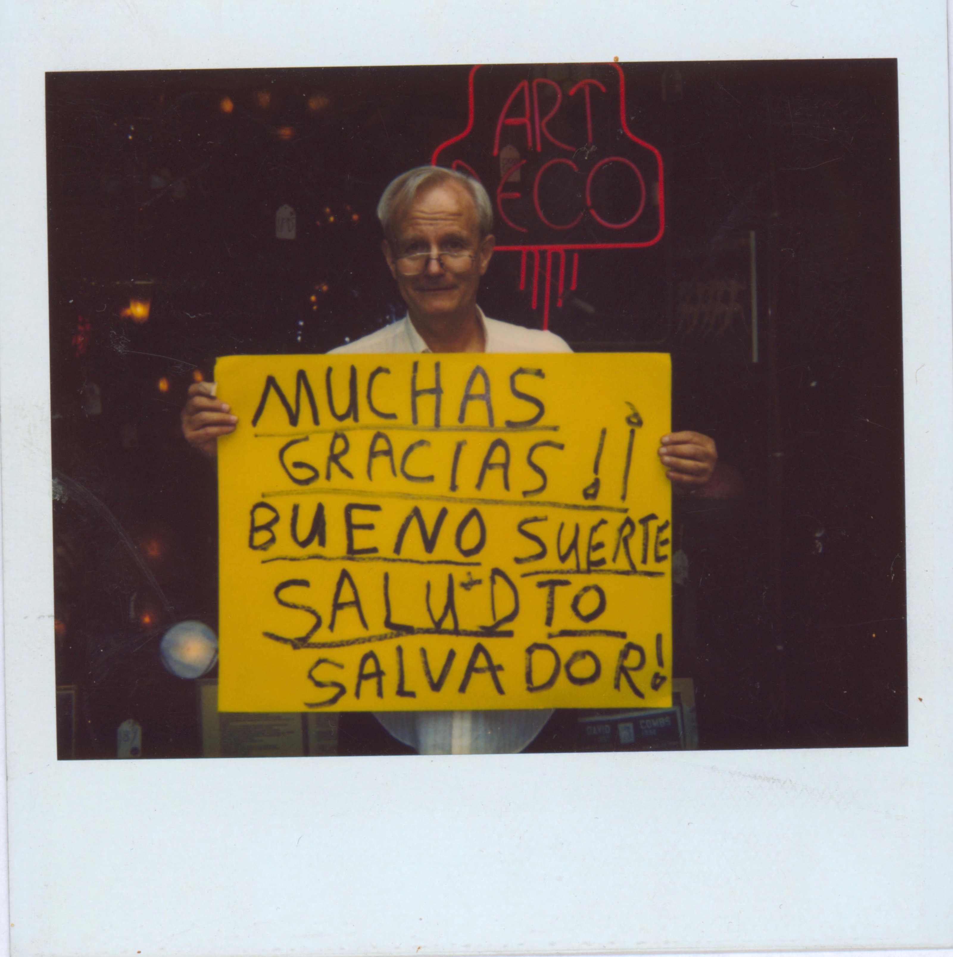 Photographs of Randy Wicker holding a yellow farewell sign for his friend, Melissa, who also helped at this store, Uplift Lighting. The sign reads "Muchas Gracias!! Bueno Suerte Salud to 'Salvador.'"