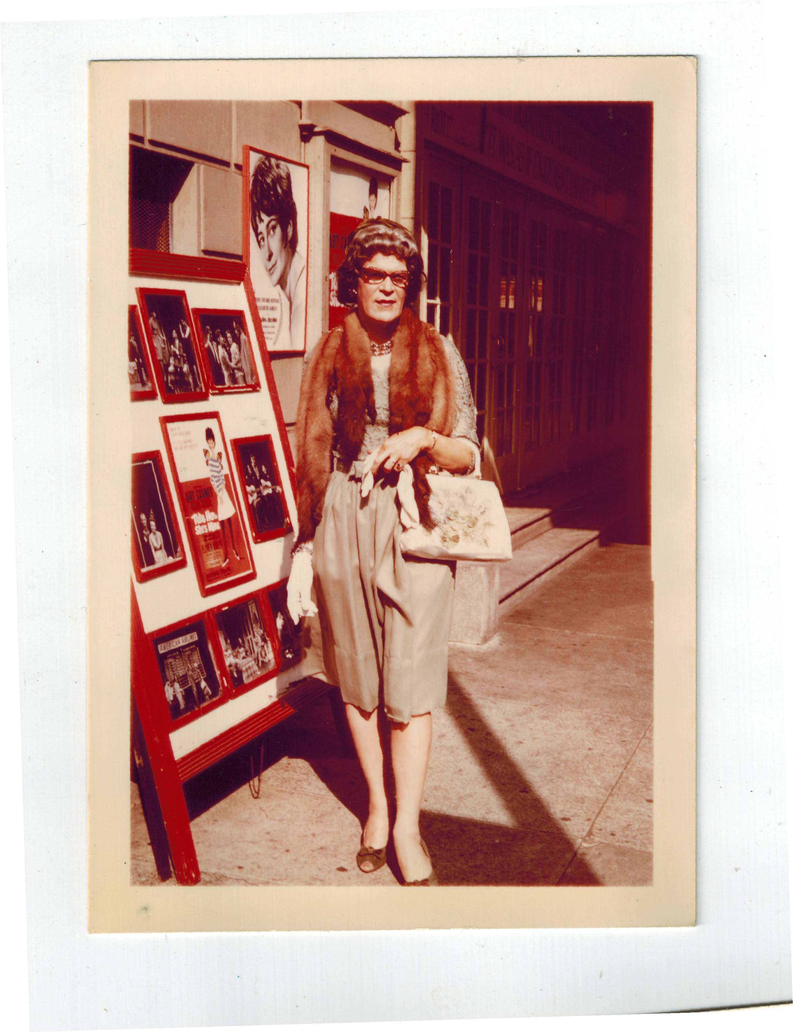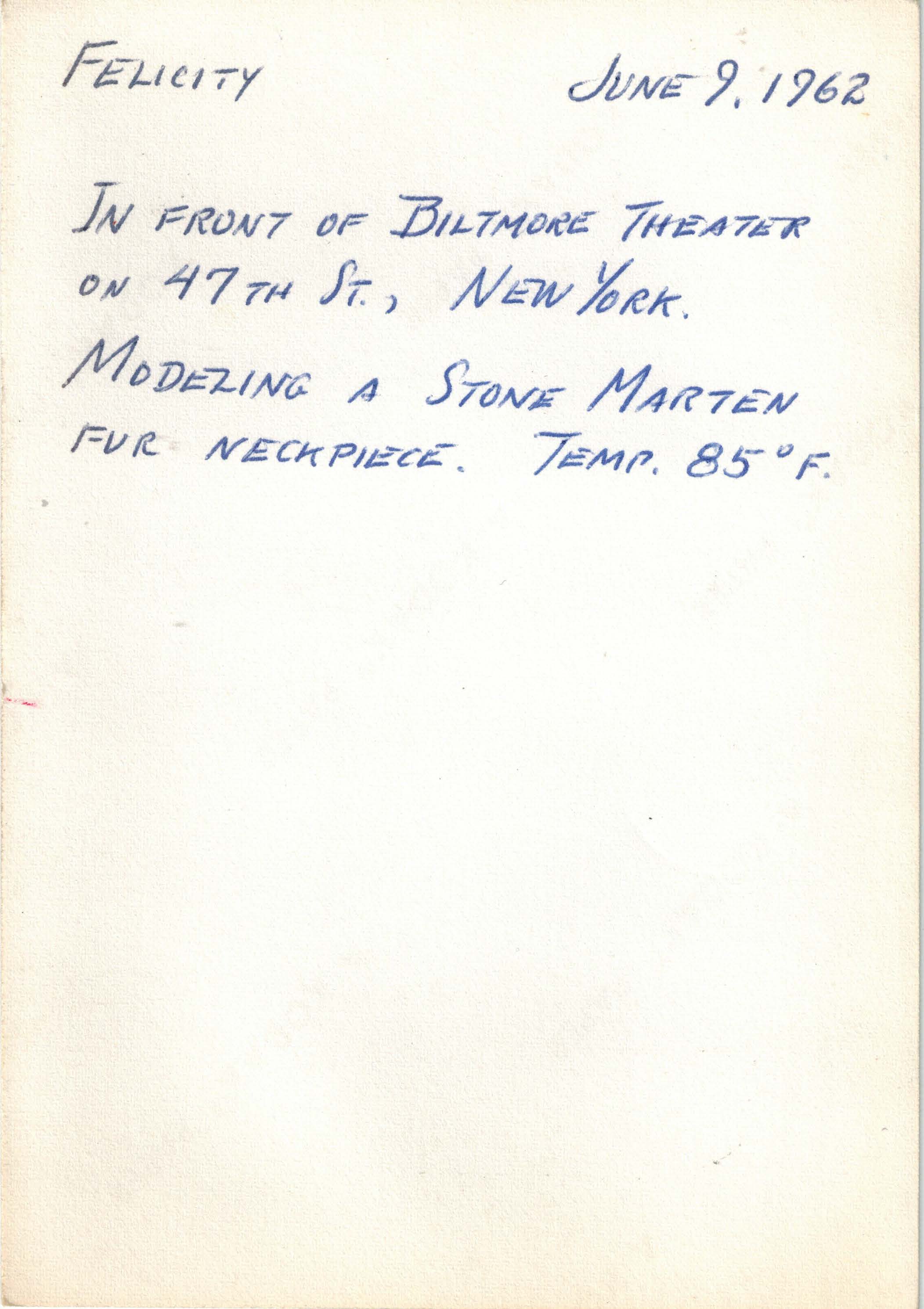 A photograph of Felicity Chandelle modeling a Stone Marten fur neckpiece in front of the Biltmore Theater.