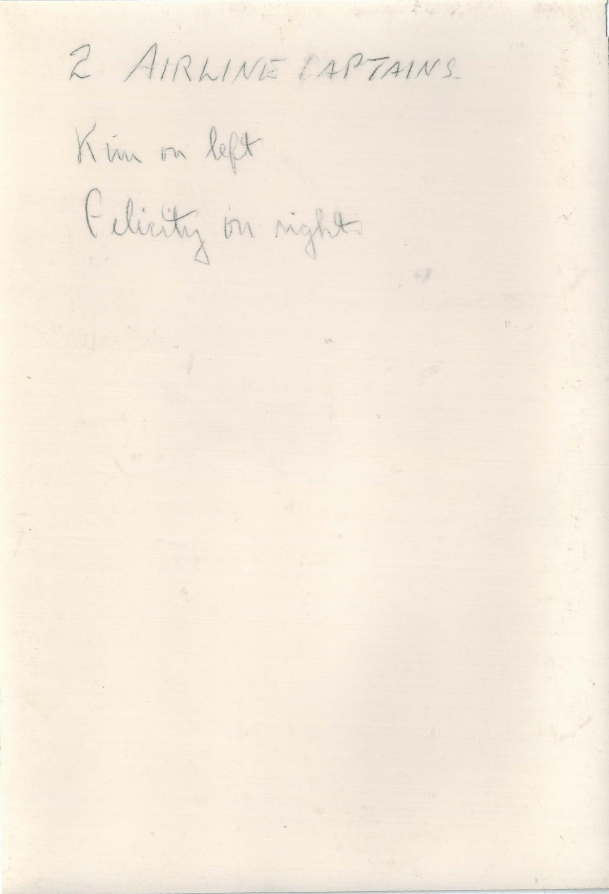 Kim (left) and Felicity (right) standing in a dining room. "2 airline captains" is written on the back of the photo. Felicity Chandelle was one of the first commercial airline pilots.