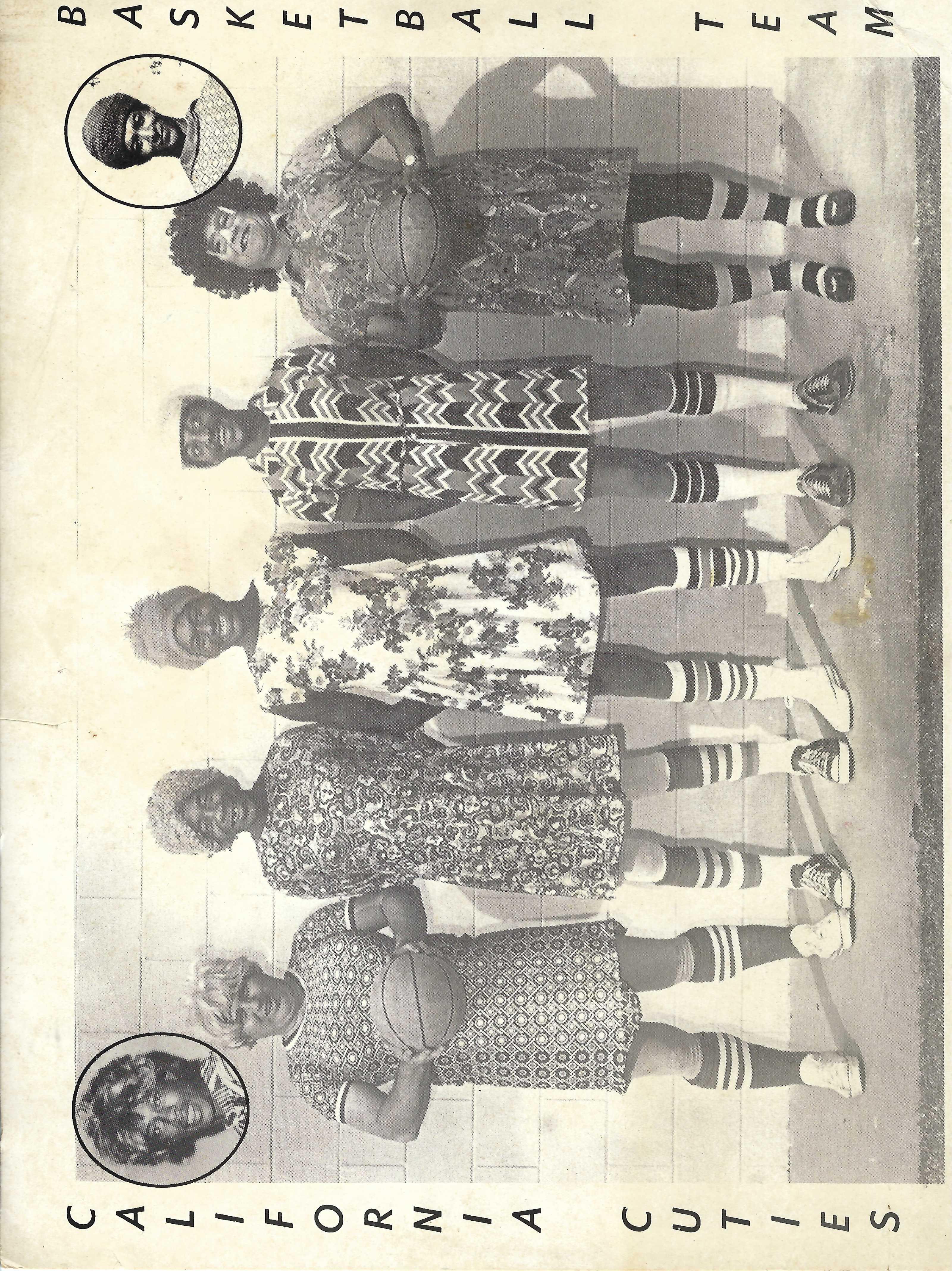 Photograph of the California Cuties Basketball team, smiling with players holding basketballs at each end.