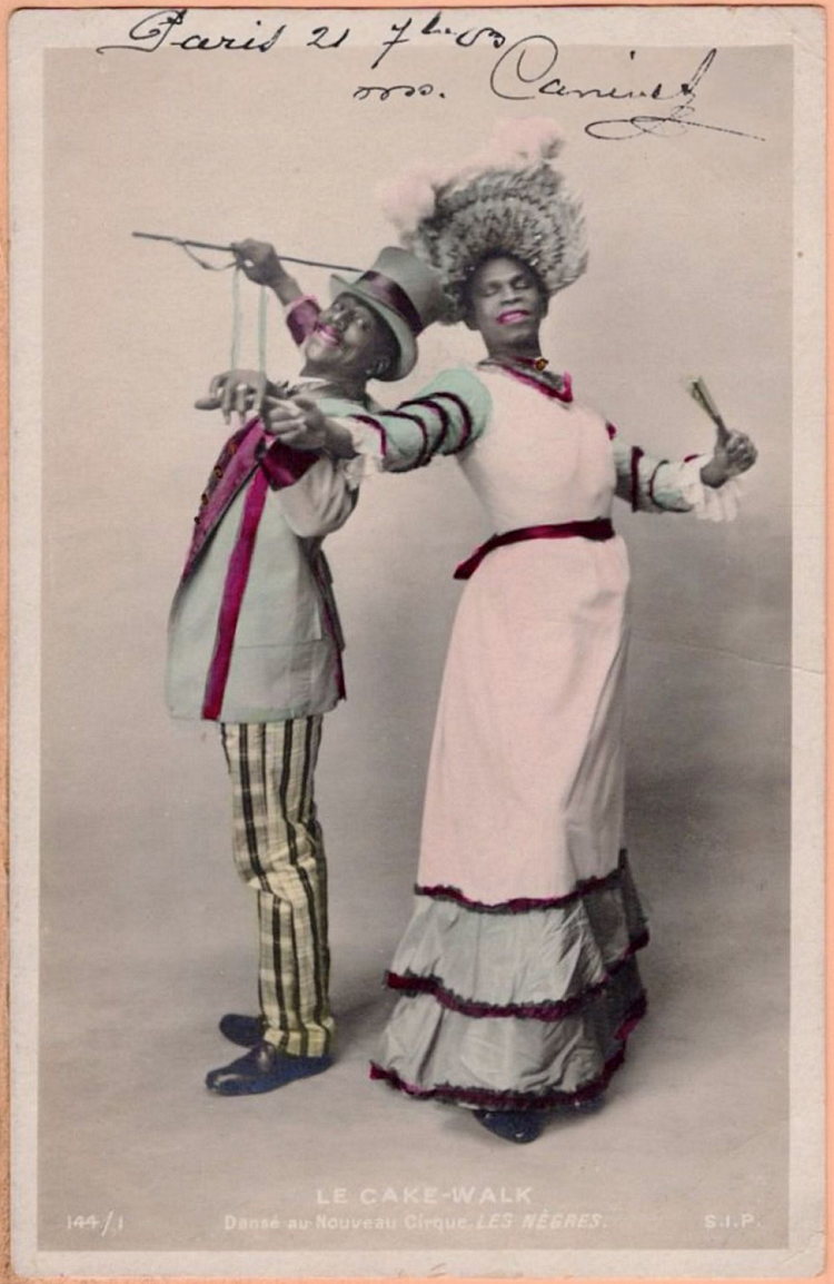 In the first image, Jack Brown and Charles Gregory stand facing away from each other, each with one hand reaching toward the camera, smiling. In the second, details within the photo have been colorized in red, green, and yellow. “Paris 21 February” is handwritten across the top. Brown and Gregory performed the Cake-Walk, a very popular dance, as part of “Les Joyeux Nègres" at the Nouveau Cirque in Paris from 1902-1903.