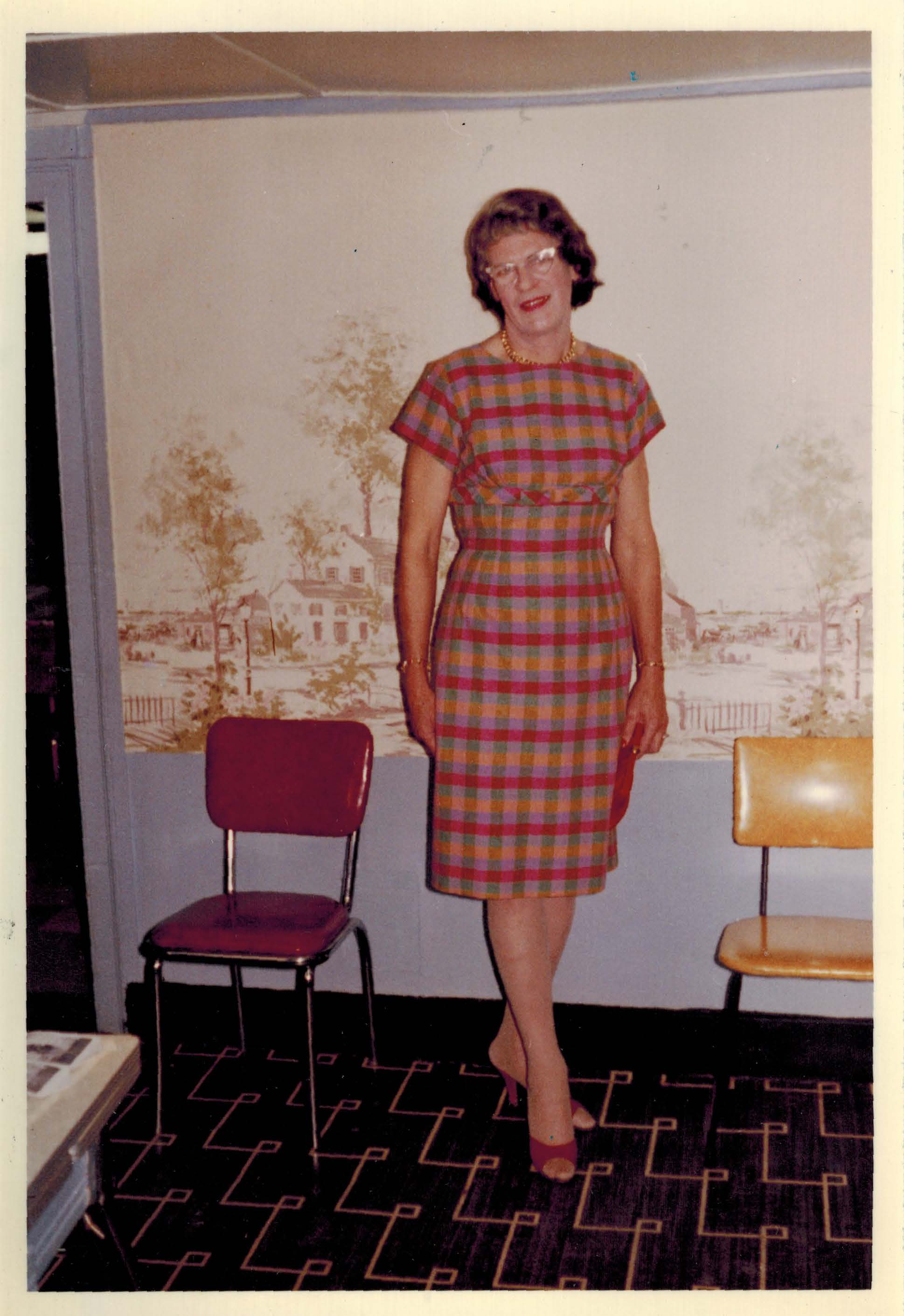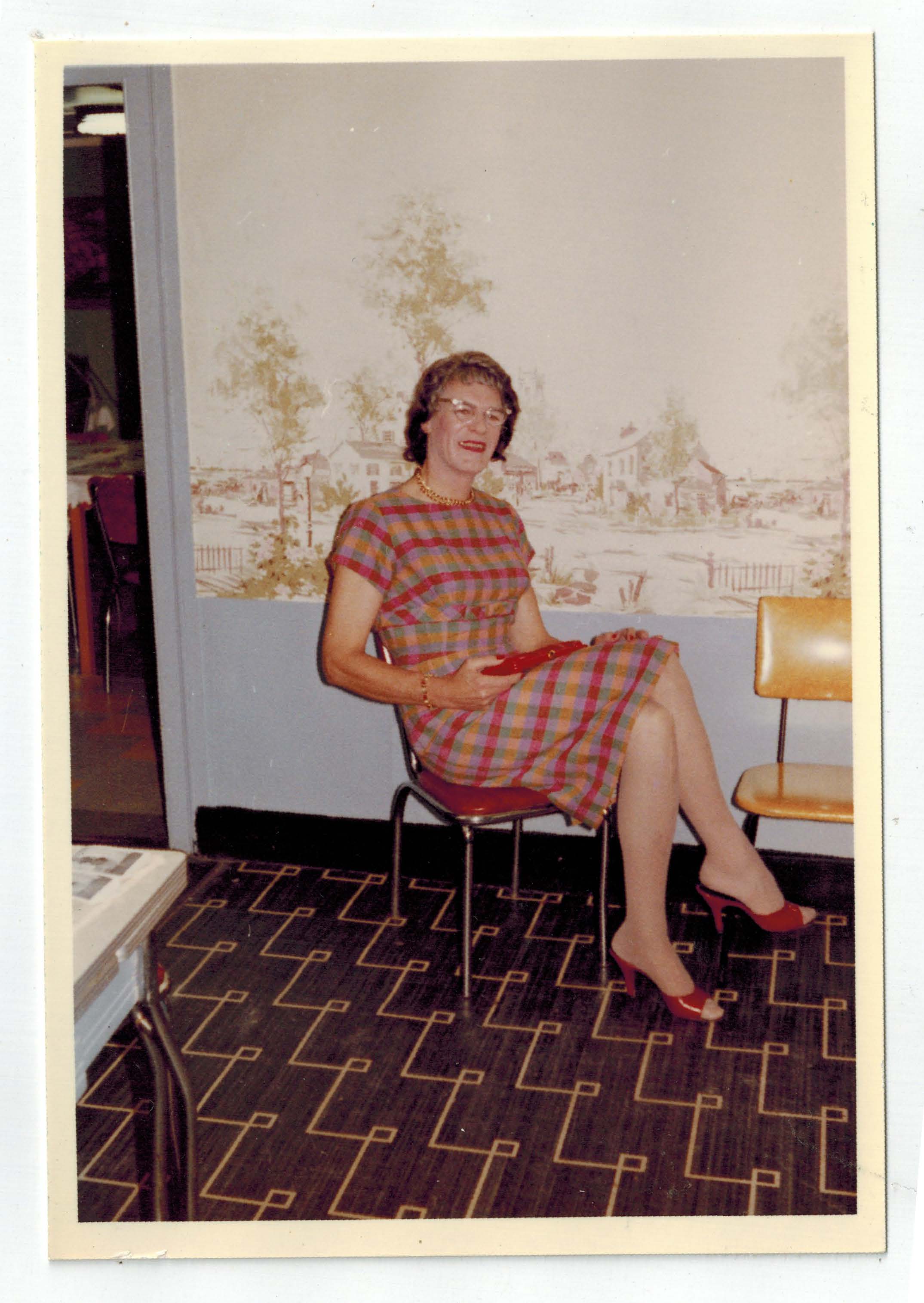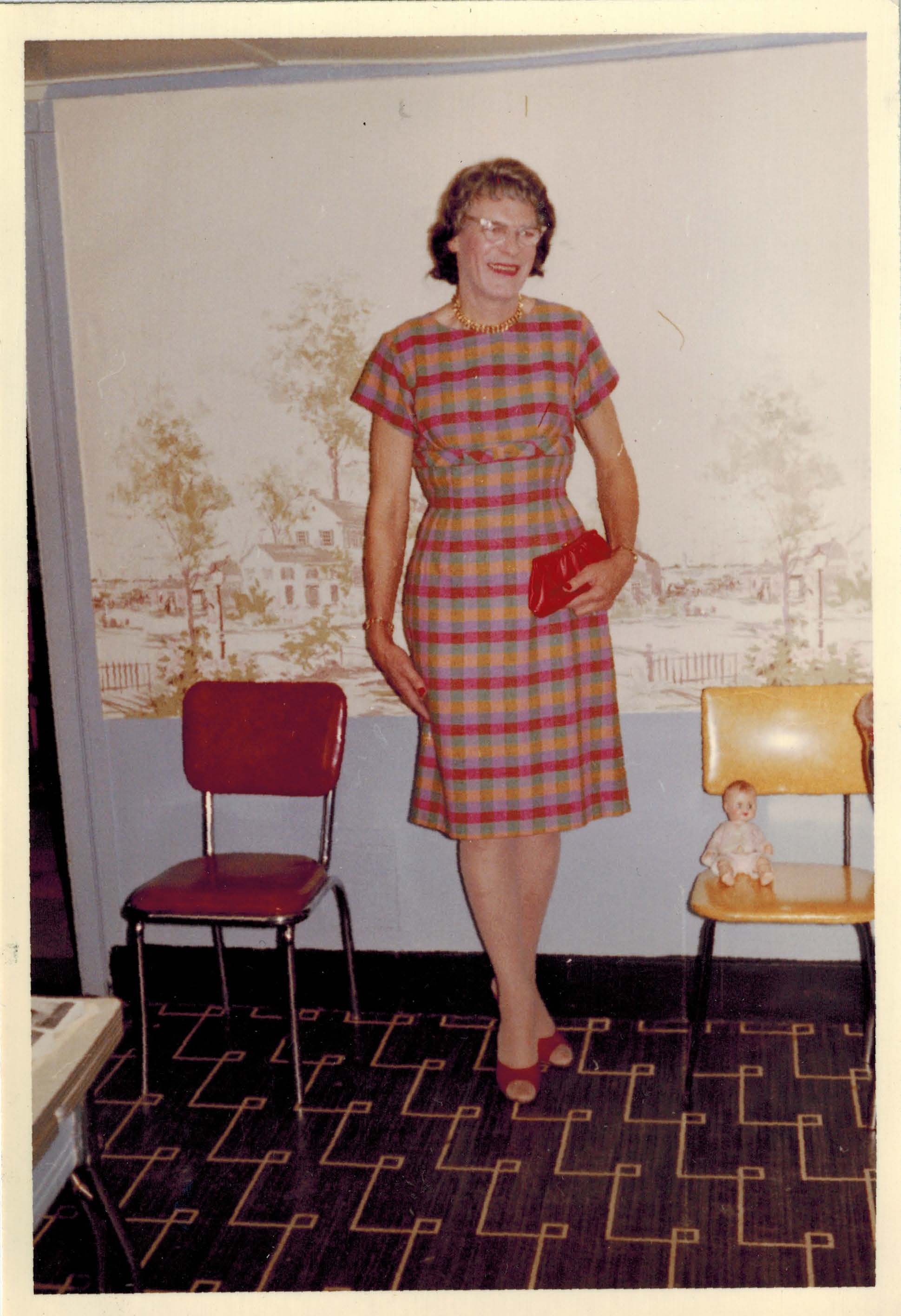 Photographs of Felicity Chandelle posing in a colorful plaid dress and red heels.