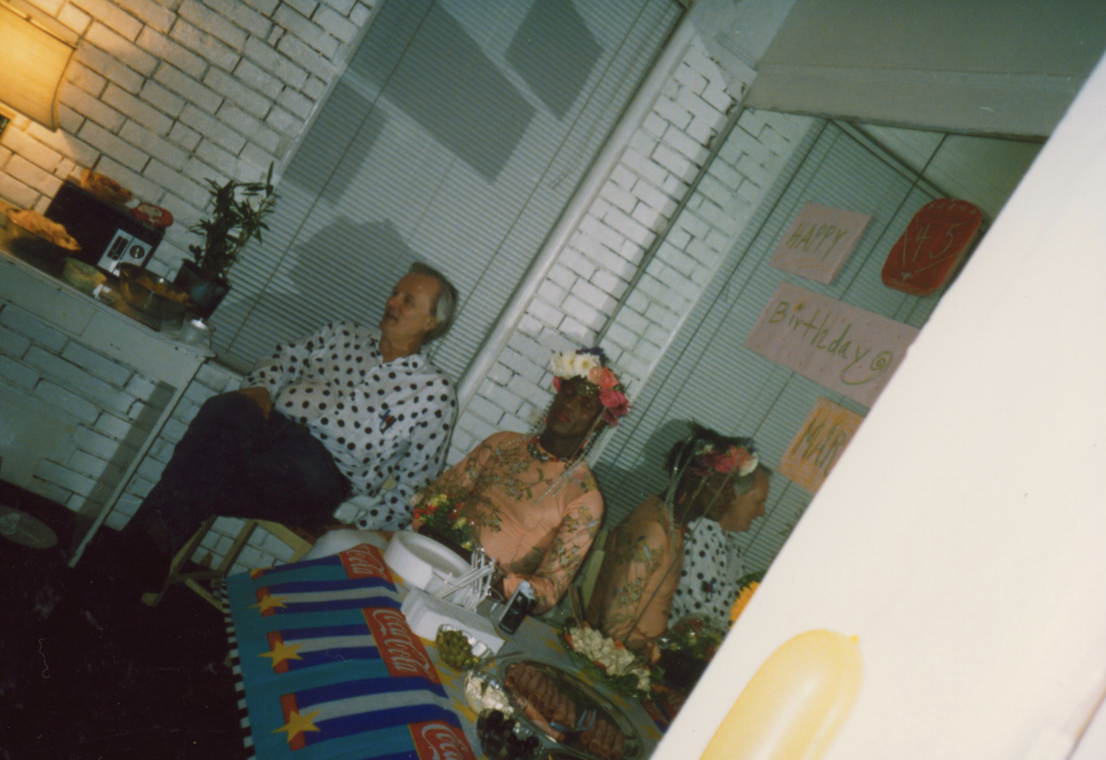 A photograph of Marsha P. Johnson sitting next to her roommate Randy Wicker at her birthday party. They’re sitting in front of a mirror, which has signs taped to it that read “Happy Birthday Marsha.” They’re also next to a table with food, paper plates and plastic cutlery on it. Marsha’s wearing a pink floral dress and a floral headpiece. Randy’s wearing a black and white polka dot shirt.