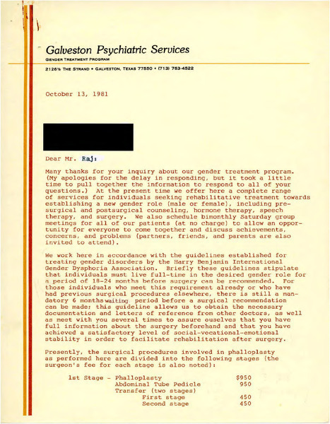 Letter from Collier to Rupert Raj describing the gender affirming surgery and care the Galveston Psychiatric Services Gender Treatment Program offers. The letter includes a timeline of surgeries and an in-depth description of the procedure, time, and fees.