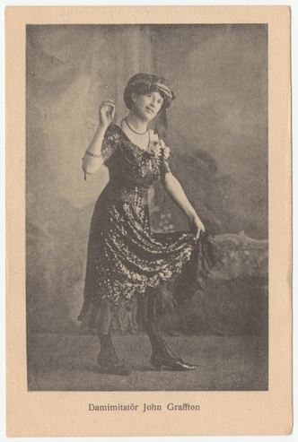Inscription: Recto: Brief note in Swedish on lower margin. Verso: Addressed to “Bevärignrekryten Herr Gustaf Nicklasson” and with a message in Swedish signed “Justina C. Svenson”. Grafton still looking plain—and still hiking up a fancy showgirl dress to display ankles and a bit of leg.Divided verso. Stamp and postmark on verso. Addressed to a “military recruit” in Germany.