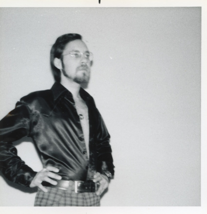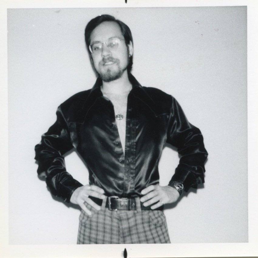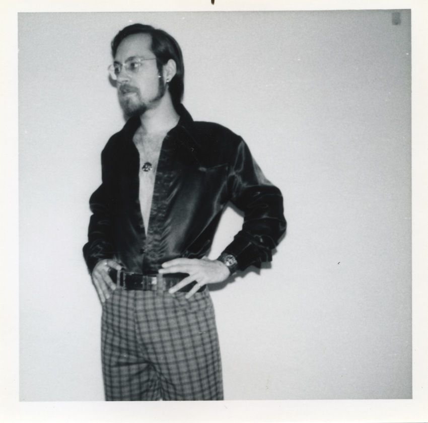 Black and white photographs of Rupert Raj posing with his hands on his hips wearing an unbuttoned shirt and plaid pants.
