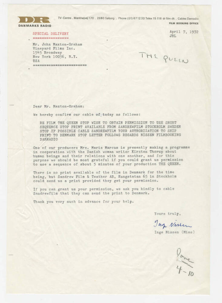 Executive producer Lewis M. Allen’s files for the documentary film The Queen (1968)—a behind-the-scenes look at the 1967 Miss All-American Camp Beauty Pageant in New York City—including correspondence, invoices and certiicate related to the film's distribution in Denmark and other European countries.