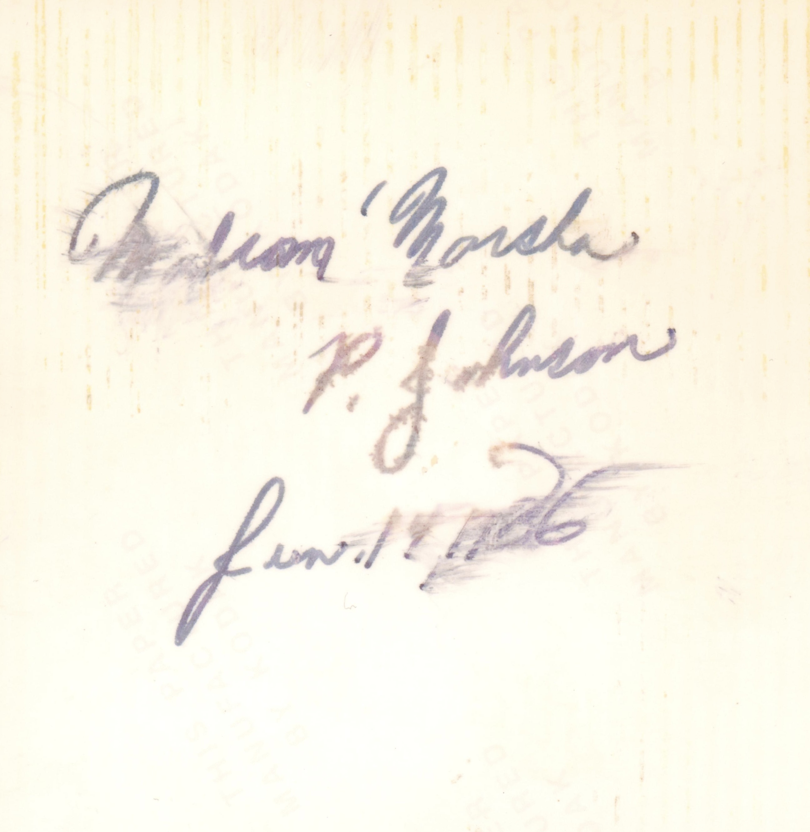 A photograph of Marsha P. Johnson wearing a yellow t-shirt that reads "New York 1985." She is sitting at a table with a cake in front of her. The back of the photograph reads "Malcolm 'Marsha P. Johnson, June 14, 1986."