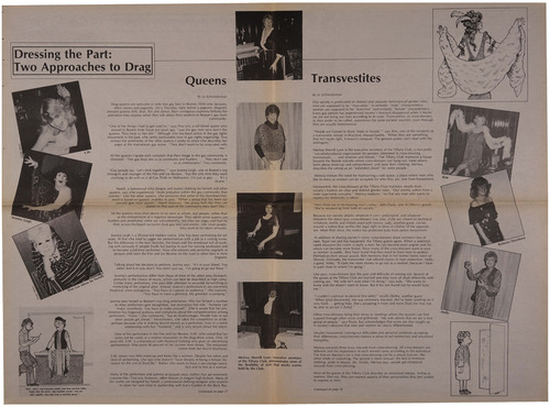 A compilation of interviews with drag queens, transsexual women, and crossdressers. Touches on the drag scene in Boston, presenting and passing as a woman, the threat of sexual assault, and relationships. Originally published on pages 12 and 13 of volume 11 number 41 of Gay Community News.