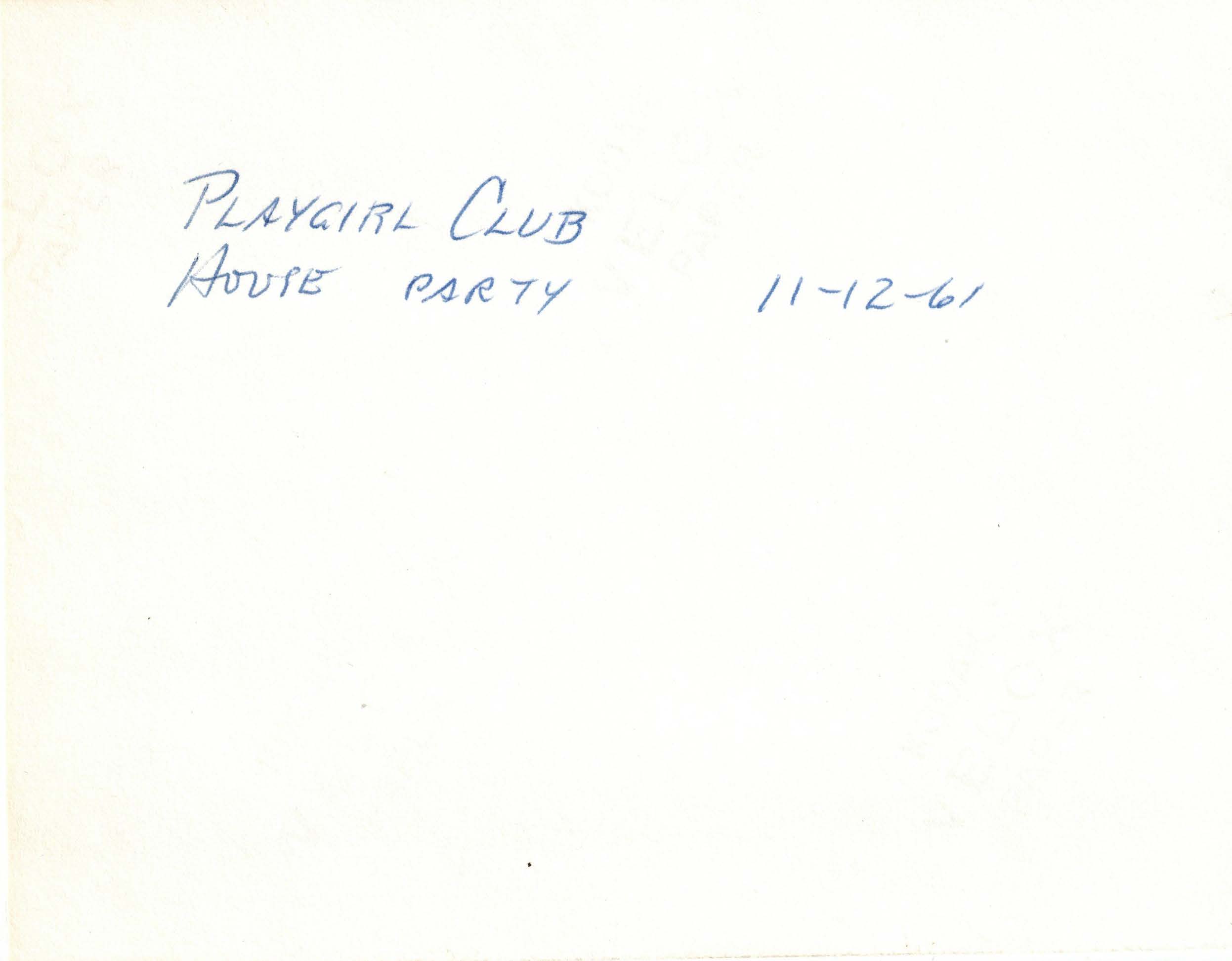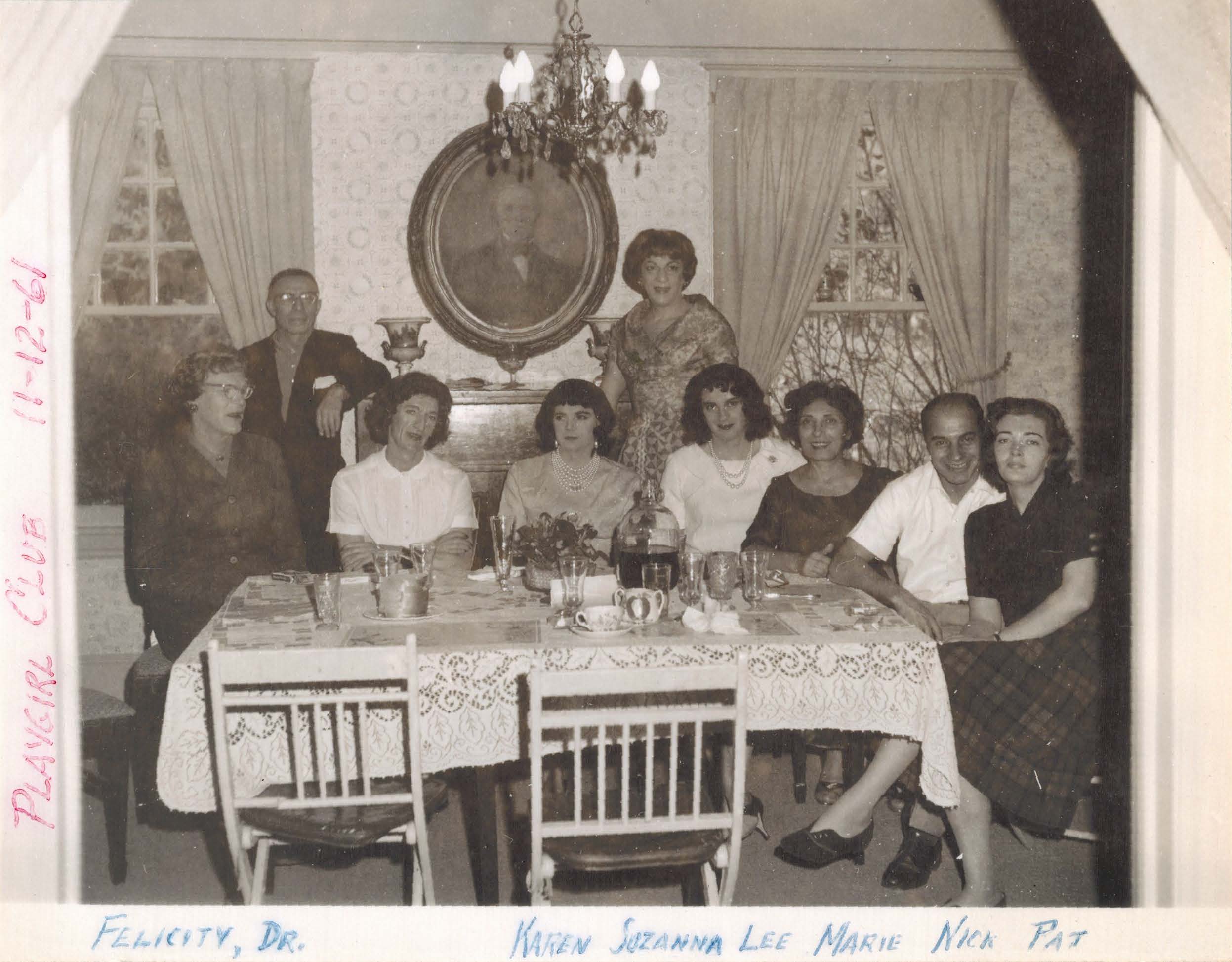 A black and white photograph of Playgirl Club members arranged around a dining table at the first house party. Pictured from left to right: Felicity, Doctor, Karen, Suzanna, Lee, Marie, Ken, Pat.