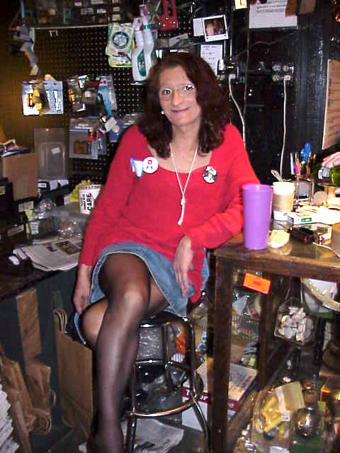 Photographs of Sylvia Rivera sitting on a stool wearing glasses, a red shirt with buttons pinned to it, a denim skirt, and black tights. She's leaning her arm against a table. She's at Randy Wicker's store Uplift Lighting.