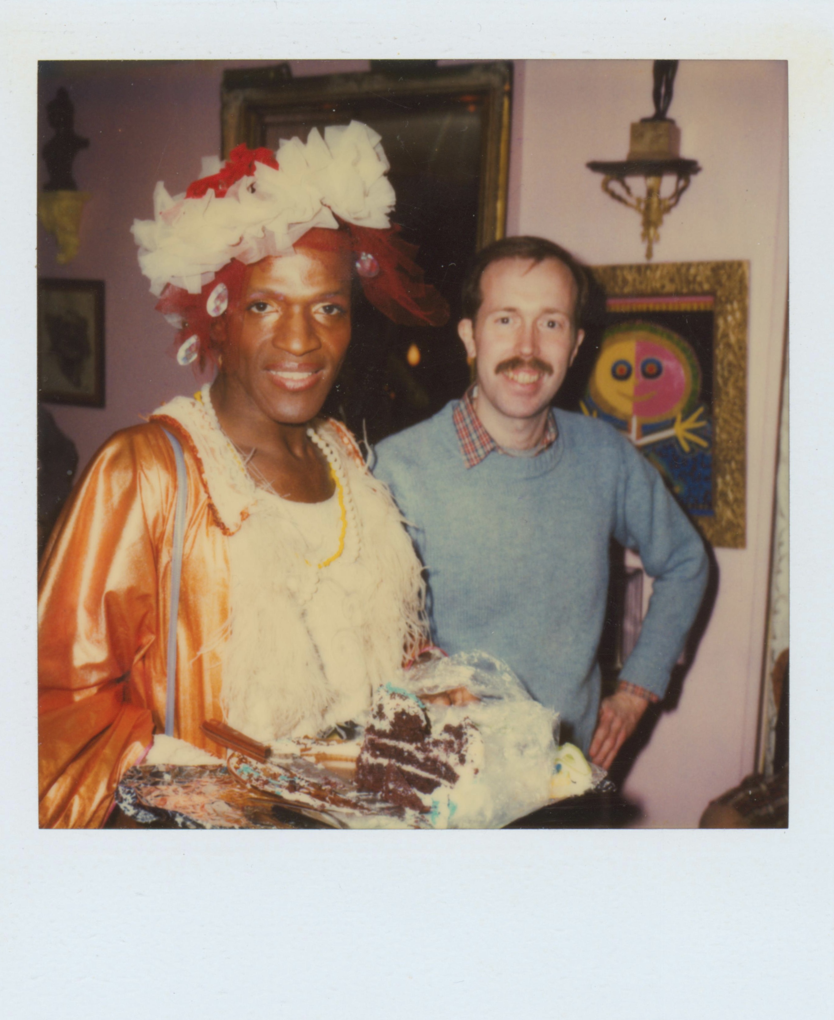 A Polaroid of Marsha P. Johnson wearing a white and red tulle headpiece and a white and orange dress. She’s holding a tray of cake in front of her, standing next to another person wearing a plaid flannel under a blue sweater.